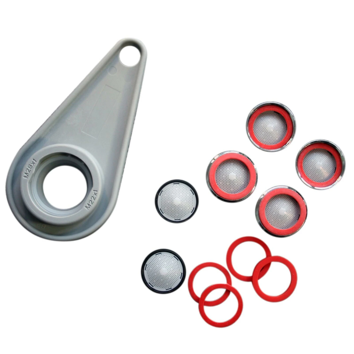 Praktisches Mischdüsenset, das aus verschiedenen Mischdüsen, Einsätzen und vier Ersatzdichtungen. Der Montageschlüssel aus Kunststoff erleichtert die Montage.