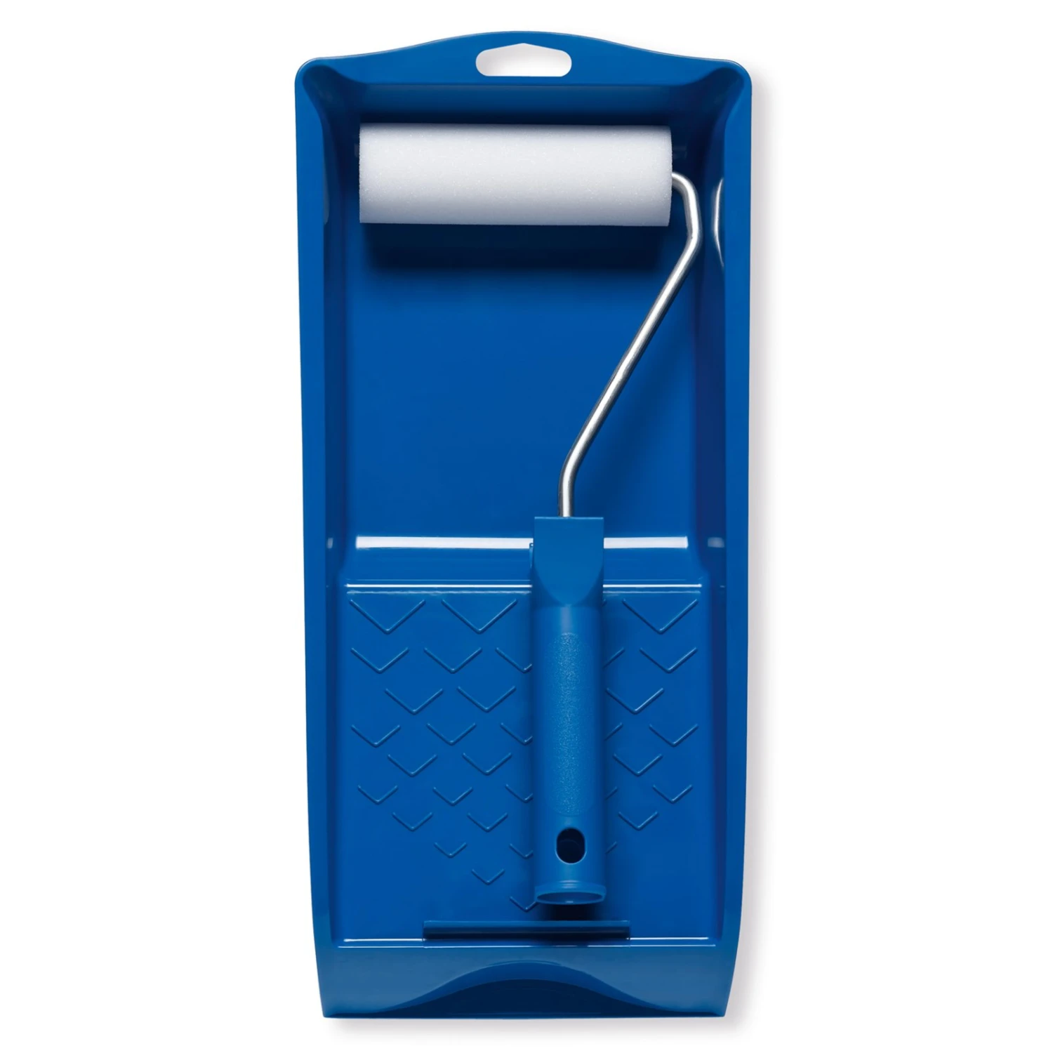 Das praktische Set beinhaltet eine Lackierwalze mit Bügel sowie eine Lackierwanne aus blauem Kunststoff.