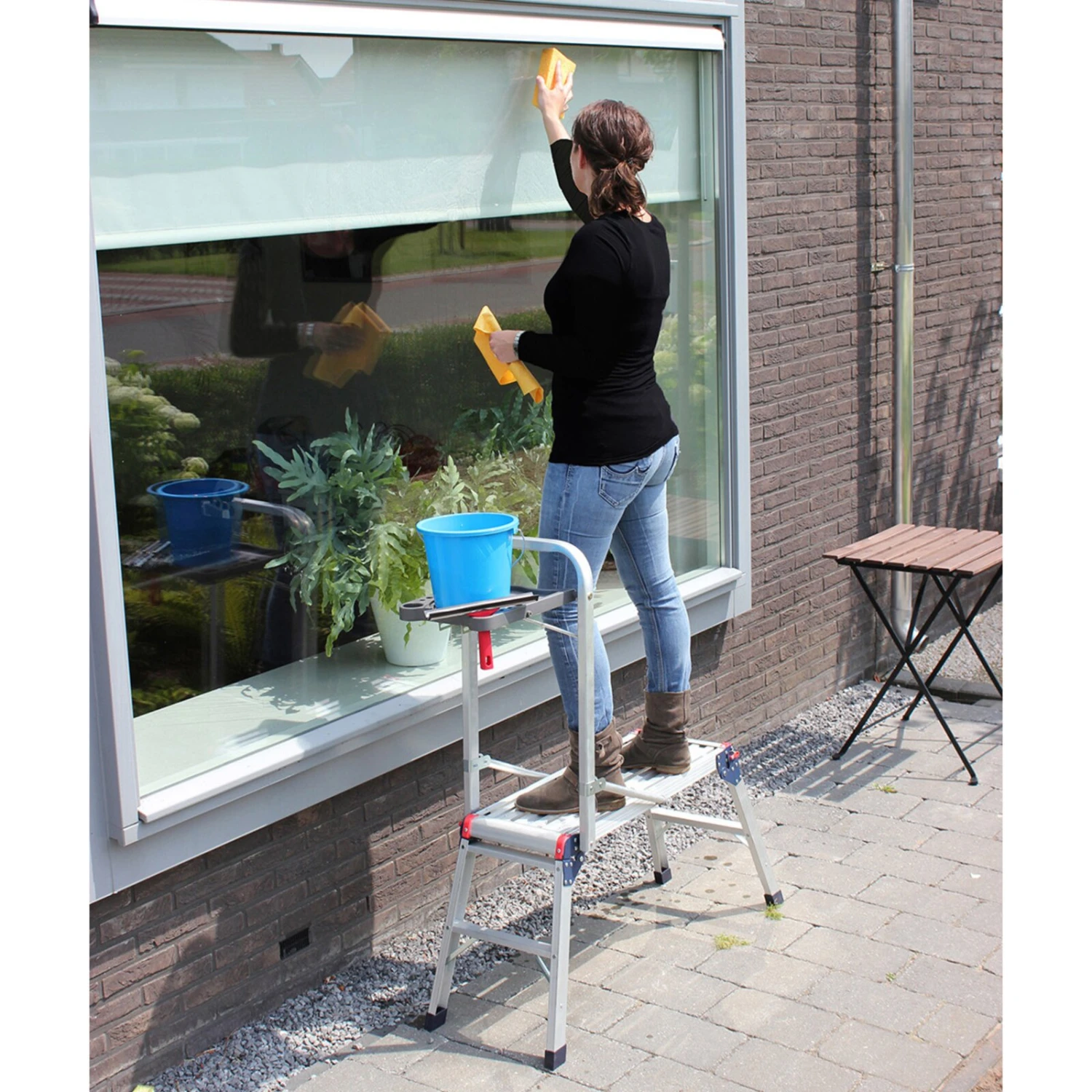 Für Arbeiten an einer höher gelegenen Stelle ist diese Arbeitsplattform genau der richtige Helfer! Die rutschfeste Arbeitsfläche und die abschließbaren Scharniere sorgen für Sicherheit.