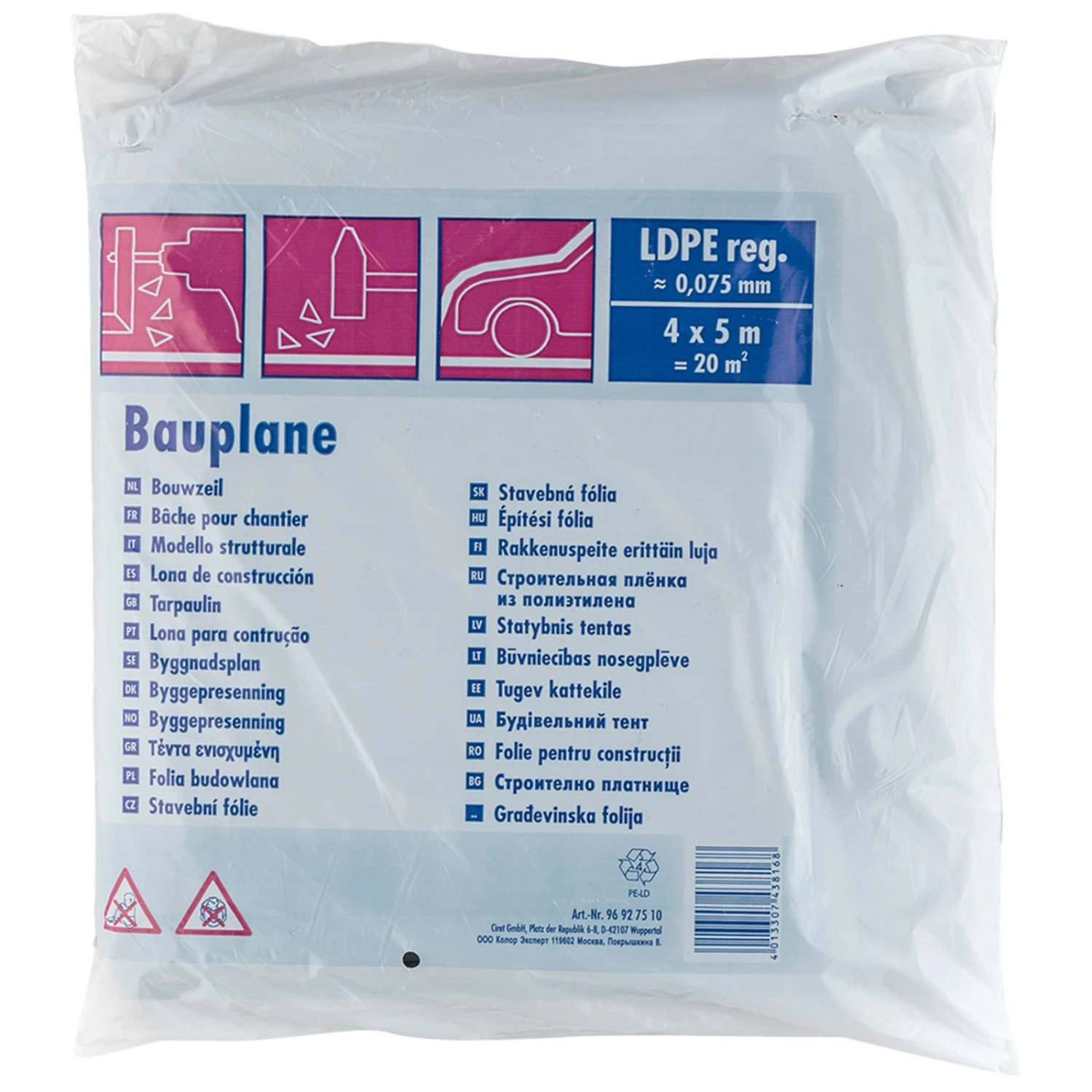 Diese transparente Bauplane ist für eine Gesamtfläche von etwa 20 m² ausgelegt. Sie schützt bei Bauarbeiten sowie bei Tapezier- und Streicharbeiten.