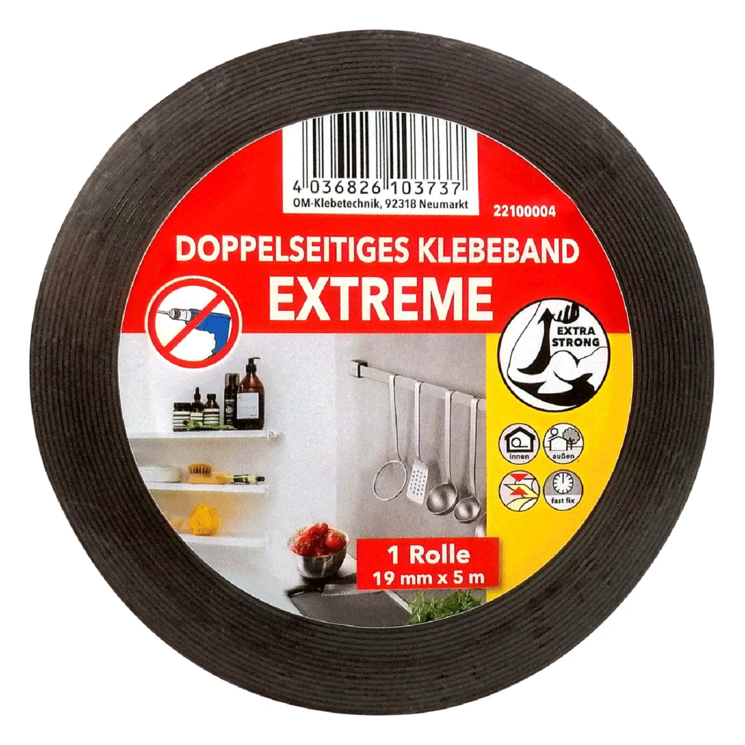 Vielseitig einsetzbares doppelseitiges Klebeband mit einer Länge von etwa fünf Metern.