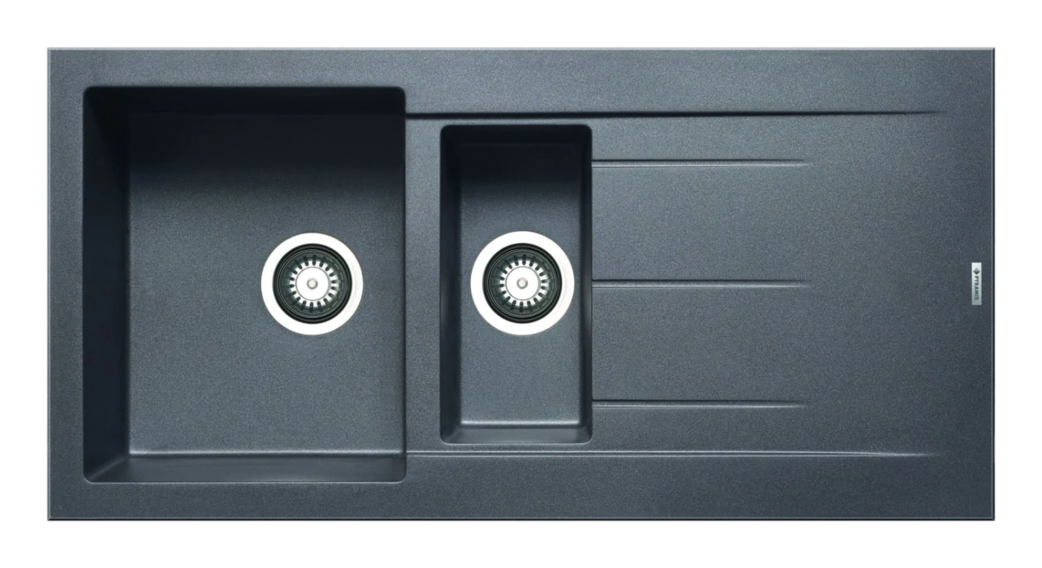 Attraktive Pyragranite-Einbauspüle ALAZIA 1 1/2B 1D mit kleinen Eckradien, Restebecken und moderner Abtropffläche. Für Unterschränke mit einer Breite von ca. 60 cm.