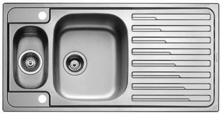Praktische Edelstahl-Einbauspüle 1 1/2B1D bestehend aus einem geräumigem Becken, einem Restebecken außen und einer geprägten Abtropffläche.