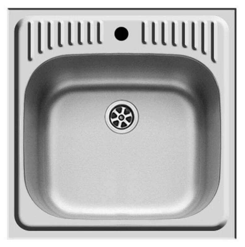 Edelstahl-Einbauspüle mit einem Becken und Hahnbank hinten zur Montage der Armatur. Hahnbank geriffelt zum besseren Wasserablauf.