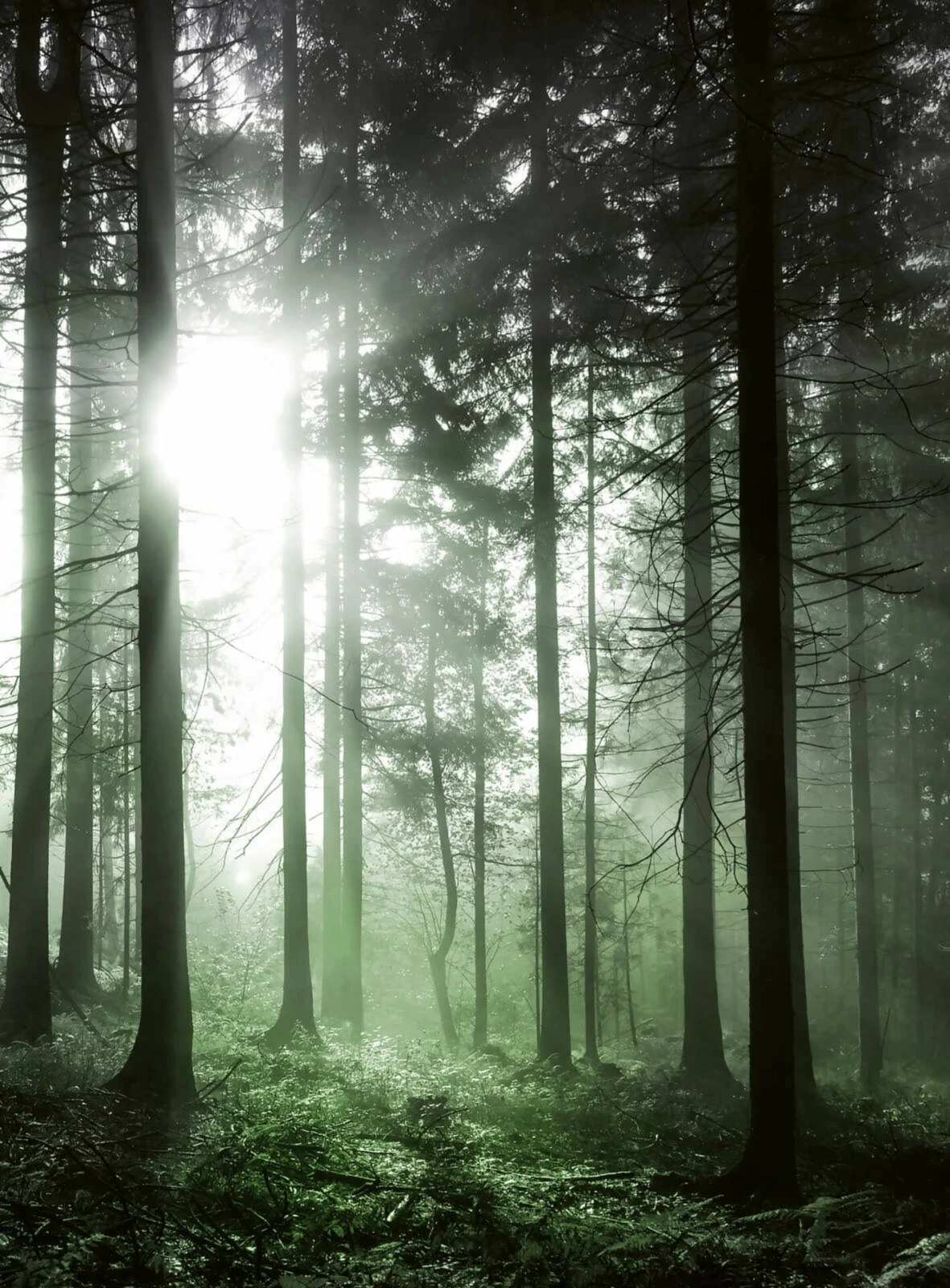 Fototapete DESIGNWALLS 2.0 – grün-schwarz – Walddämmerung – 2,6 Meter