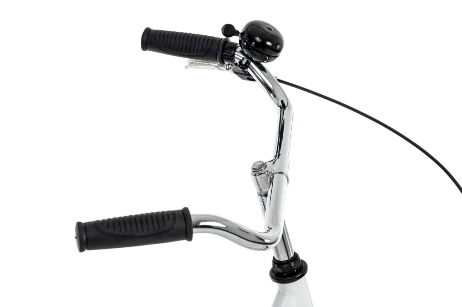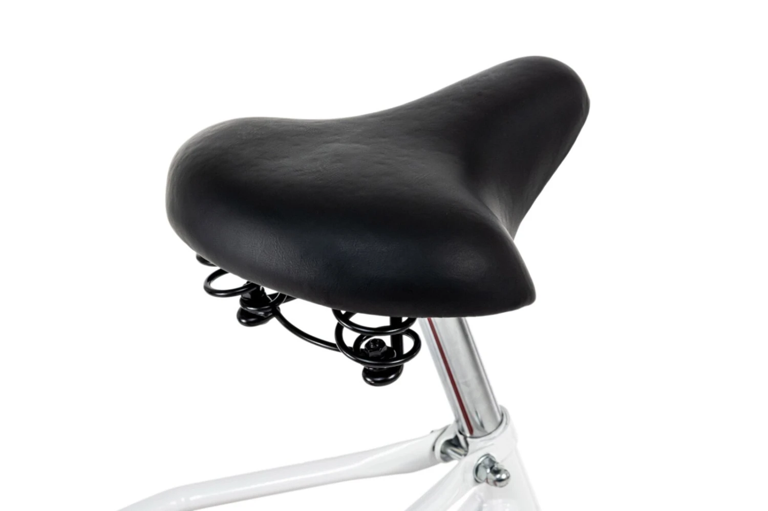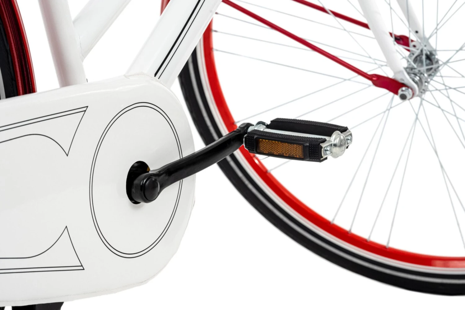 Gehalten im klassischen Weiß, aufgelockert mit roten Schutzblechen und Felgen, ist das Fahrrad mit dem Dameneinstieg ein modischer Hingucker bei der Fahrt durch die Stadt. Es überzeugt auch durch die für ein Hollandrad bekannte, bequeme, aufrechte Sitzposition sowie den breiten Citysattel. Noch mehr Komfort bietet die Abschirmung der Fahrradkette, der klassische Zweibeinständer, Vorder- und Rücklicht, eine Rücktrittbremse und die die Ausstattung mit einer Klingel.