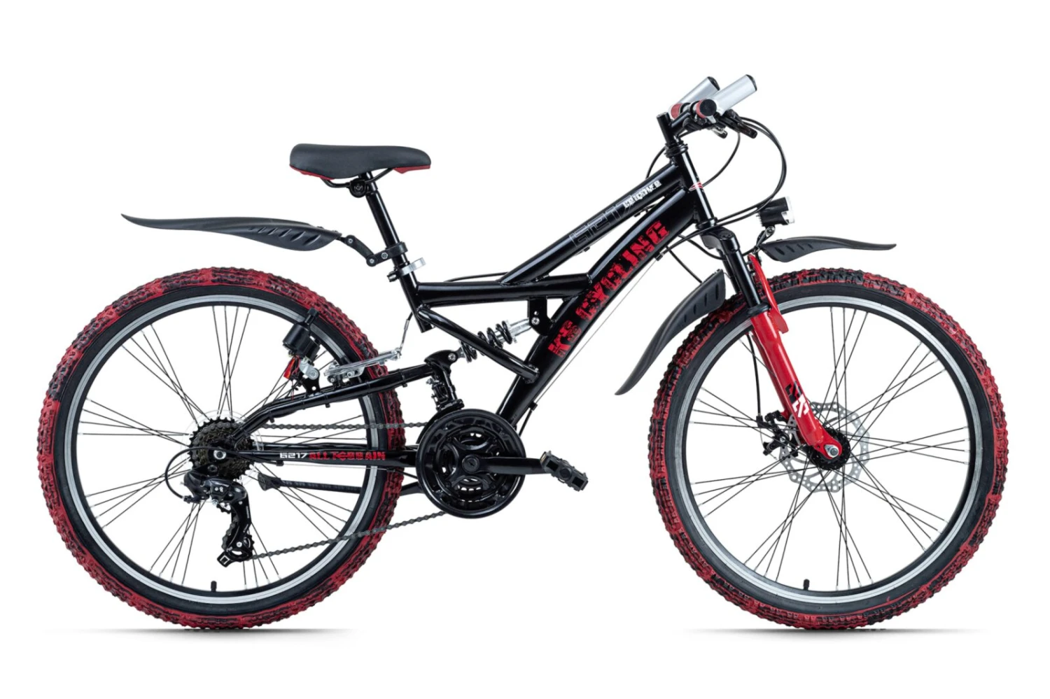 Das KS Cycling Mountainbike FULLY 24″ CRUSHER bietet neben einem auffälligen Design auch ein jederzeit sicheres Handling im Straßenverkehr und Offroad! Dank Stollenreifen und einem voll gefederten Hi-Ten Stahlrahmen sind actionreiche Touren Offroad keine Hürde für dieses Mountainbike. Die LED-Scheinwerfer vorne sorgen für sicheres Fahren auch bei Dunkelheit. Der Jugendsattel erlaubt eine komfortable maximale Belastbarkeit von etwa 80 Kilogramm.