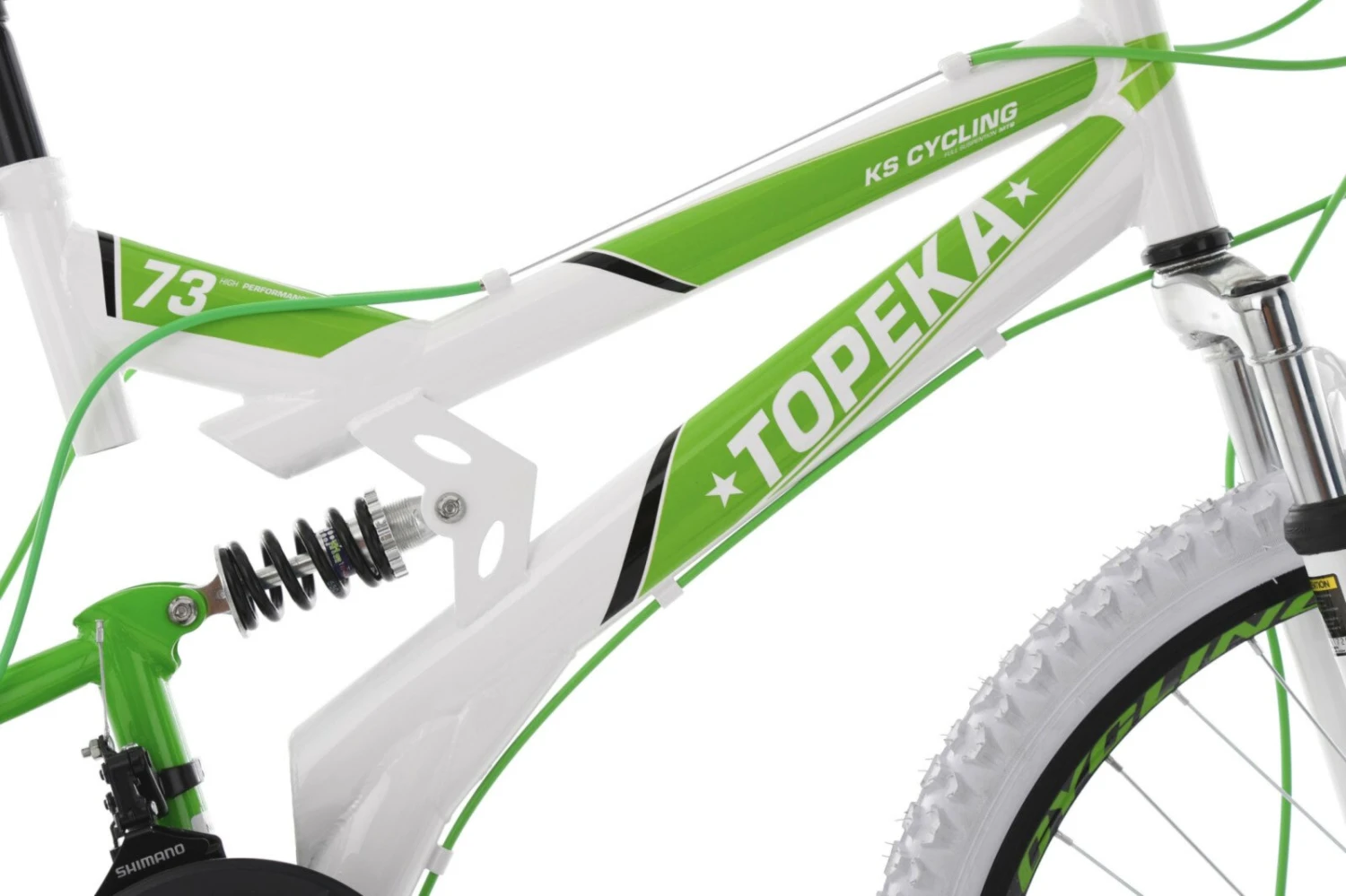 Action kommt mit diesem KS Cycling Mountainbike FULLY 26“ TOPEKA in Weiß un Grün nicht zu kurz! Für einen Hingucker sorgen die Stollenreifen, die in Weiß gehalten sind und perfekt geeignet für Waldwege oder schlammigen Boden sind. Für Sicherheit sorgen bei dem Mountainbike die V-LUXE mechanischen Wave-Scheibenbremsen. Der Rahmen ist aus HiTen-Stahl gefertigt und kann mit etwa 120 Kilogramm belastet werden. Zudem sind die Aluminium-Hohlkammerfelgen mit einem Verschleißindikator ausgestattet. Der Widerstand kann mit der 21-Gang SHIMANO Schaltung bestimmt und der Steigung angepasst werden.