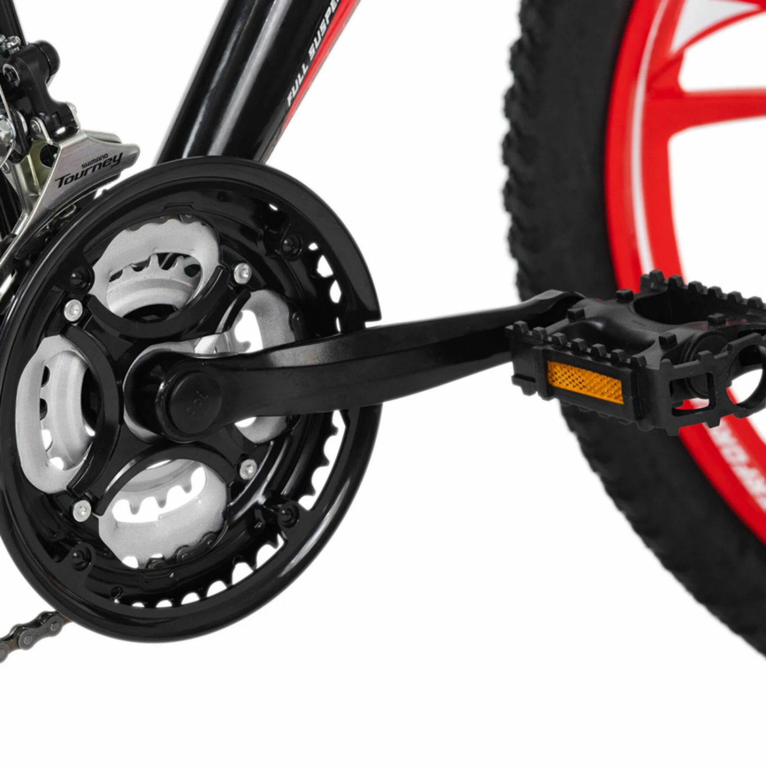 Für aufregende Radtouren ist das Mountainbike Fully TOPSPIN geradezu perfekt geeignet! Mit insgesamt 21 Gängen bist du für Steigungen ideal ausgerüstet, sodass die Hürden definitiv überwindet werden. Der gefederte Stahlrahmen sorgt dafür, dass du selbst bei holprigen Wegen stets die Kontrolle hast und ein sicheres Fahrgefühl beibehältst. Das schwarze Mountainbike mit roten Akzenten steht nicht nur dank der Hammer-Optik im Mittelpunkt, sondern die 26 Zoll-Magnesium-Aluminum-Laufräder mit gedichteten Rillenkugellagern sind hier das absolute Highlight. Für das sichere Bremsen in jeder Situatuion sorgen die mechanischen Scheibenbrembsen.