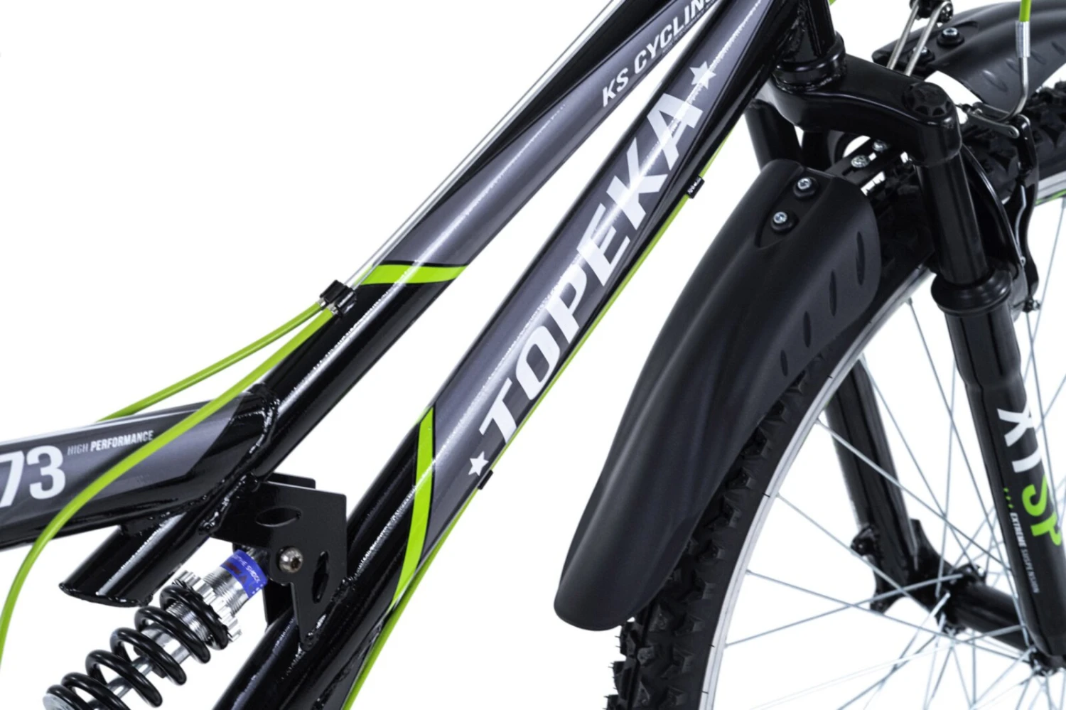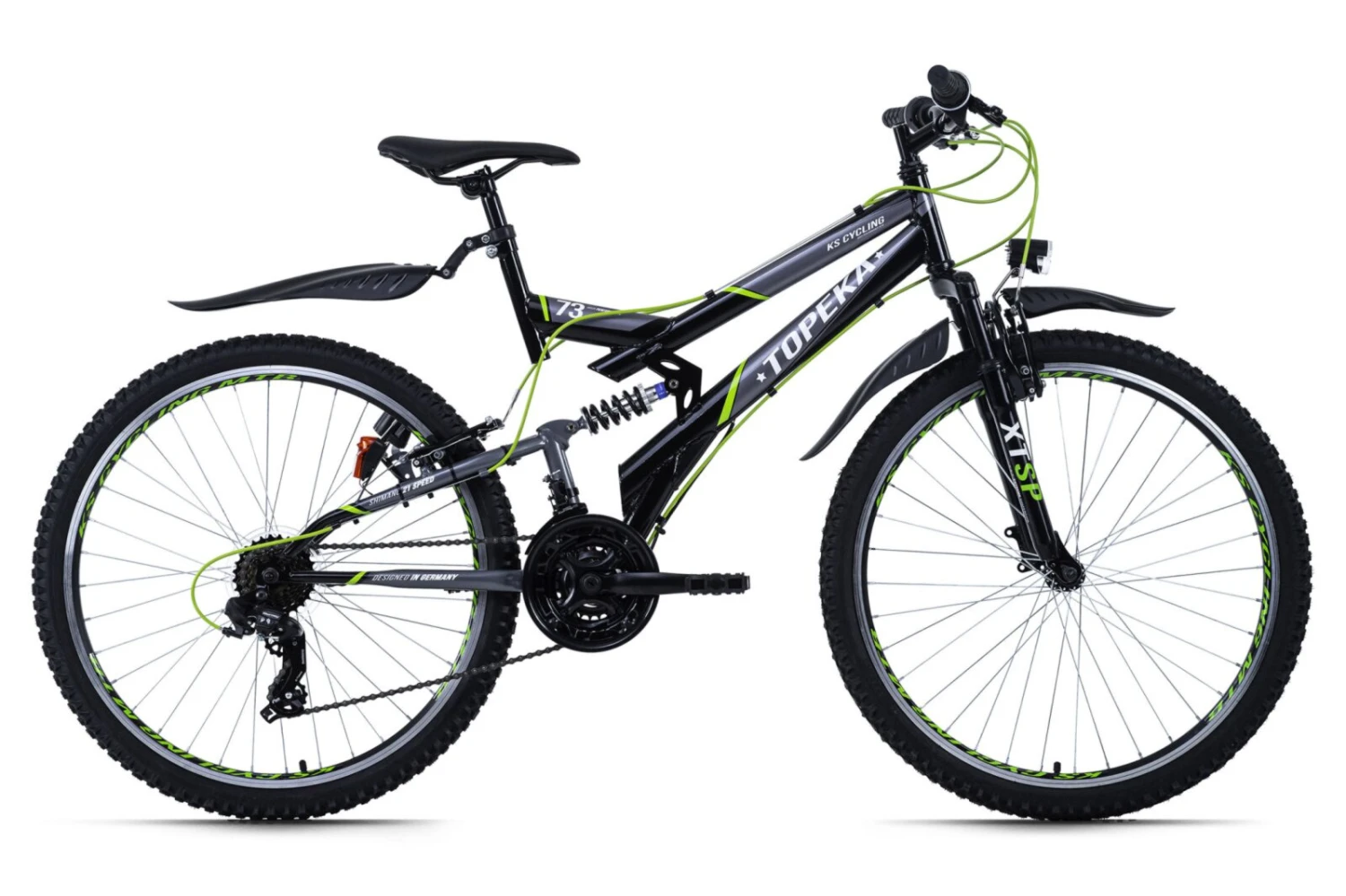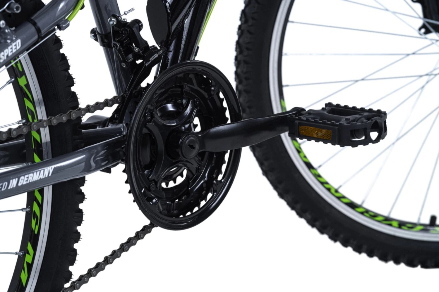Das praktische Mountainbike ist im dunklen Grau lackiert, aufgelockert mit leuchtendem Grün, und macht so mit seinem Design schon Lust auf spannende Touren abseits von normalen Wegen. Auch die Ausstattung des Fahrrads überzeugt: Neben den typischen breiten Stollenreifen ist es voll gefedert – es hat also neben der Federung an der Vordergabel auch eine Hinterbaufederung, deren Federvorspannung sich individuell einstellen lässt. Dazu kommt noch die Ausstattung mit einem Spritzschutz sowie die Beleuchtung vorne und hinten, die das MTB so auch für kurze Stadtfahrten zum Einkaufen etc. tauglich machen.