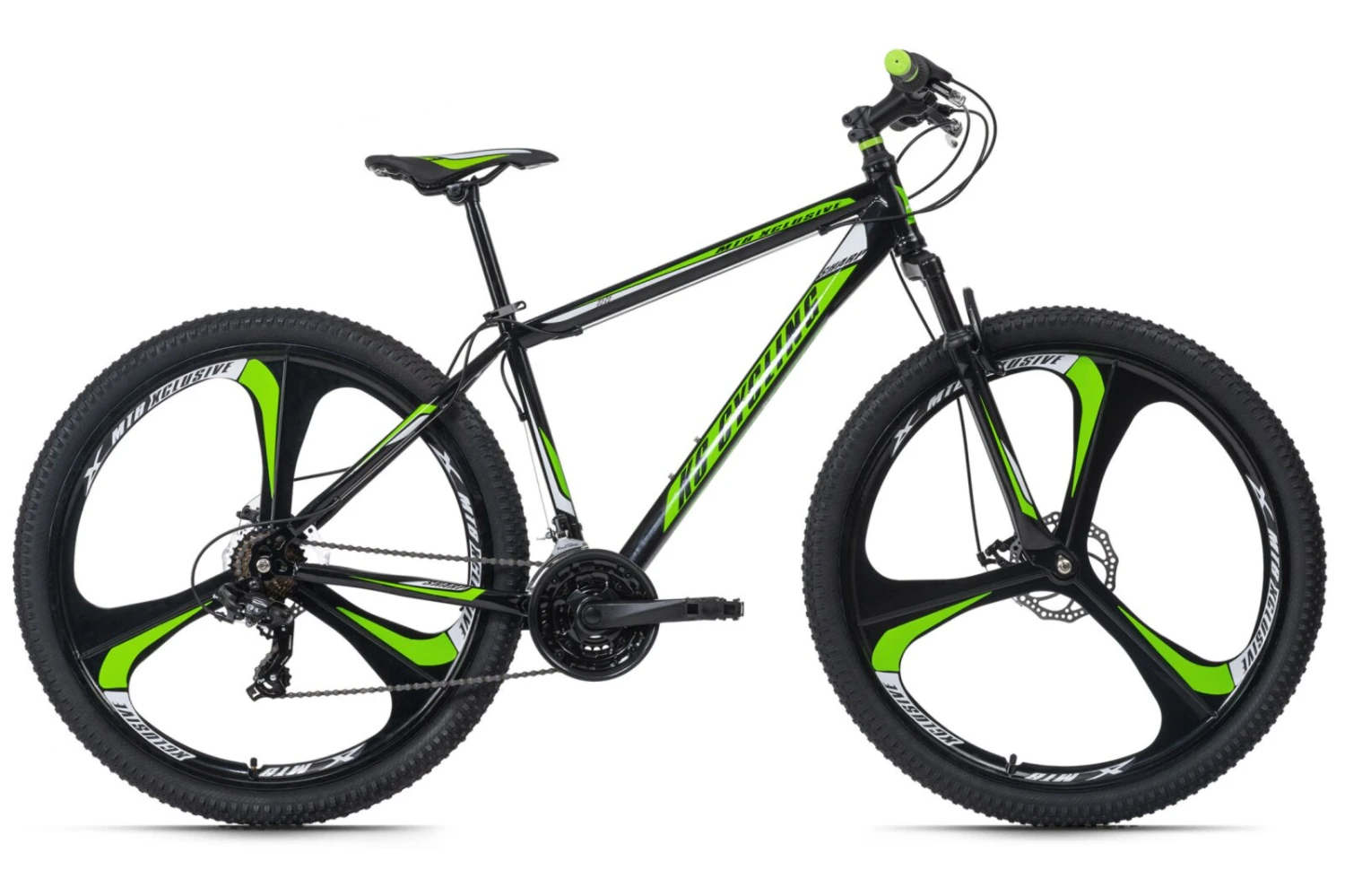 Das Mountainbikemodell SHARP von KS Cycling in Schwarz zieht durch seine grünen Details alle Blicke auf Sie. Dazu kommen die Trispokes am Vorder- und Hinterrad, die besonders robust und sportlich sind. Der Rahmen weist eine Höhe von etwa 46 Zentimeter auf und ist aus Stahl gefertigt. Ausgestattet ist das Mountainbike mit einer 21-Gang Schaltung von SHIMANO und mechanischen Wave-Scheibenbremsen.