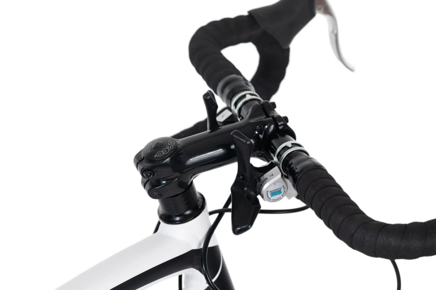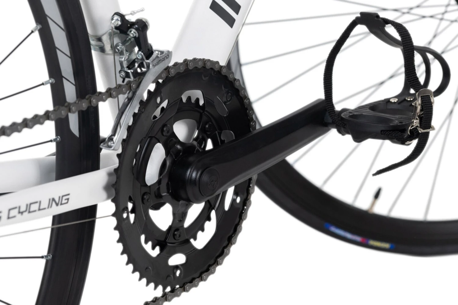 Mit diesem Rennrad ist dein Weg zur persönlichen Bestleistung frei! Das weiße Rad mit schwarzen Akzenten und dem geschwungenen Oberrohr wird zum absoluten Hingucker. Bei dem Rahmen handelt es sich um einen Aluminium-Rahmen mit auswechselbarem Schaltauge. Mit den Aluminium-Seitenzug-Rennbremsen kannst du sicher deine Geschwindigkeit regulieren. Eine 14-Gang SHIMANO-Schaltung unterstützst dich auf den verschiedensten Steigungen. Die Pedale sind bereits mit Haken und Riemen ausgestattet.