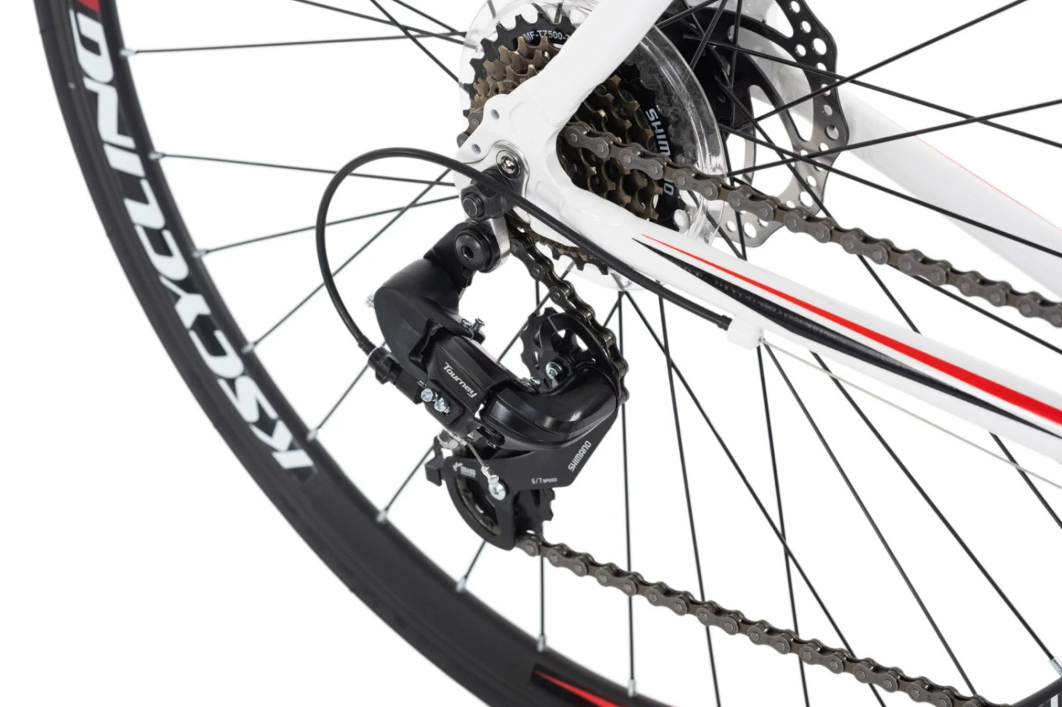 Dieses Rennrad ist ideal geeignet um zu zeigen, was du drauf hast! Das weiße Rad mit roten Akzenten sieht nicht nur optisch gut aus, überzeugt zudem mit perfekter Ausstattung. Bei dem Rahmen handelt es sich um einen Aluminium-Rahmen mit auswechselbarem Schaltauge. Die 14-Gang-Schaltung unterstützt dich auf den verschiedensten Steigungen. Für den sicheren Halt sorgen hierbei die mechanischen Scheibenbremsen. Außerdem sind im Lieferumfang Stahl-/Kunststoffpedalen mit Haken und Riemen bereits enthalten. Somit kannst du sofort losfahren!