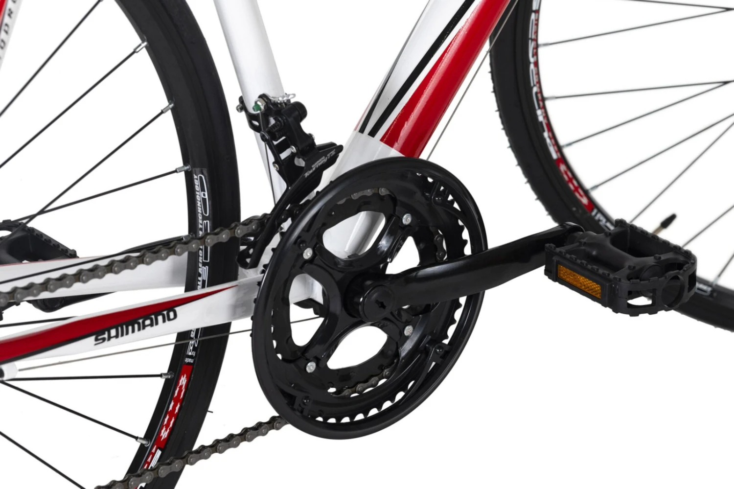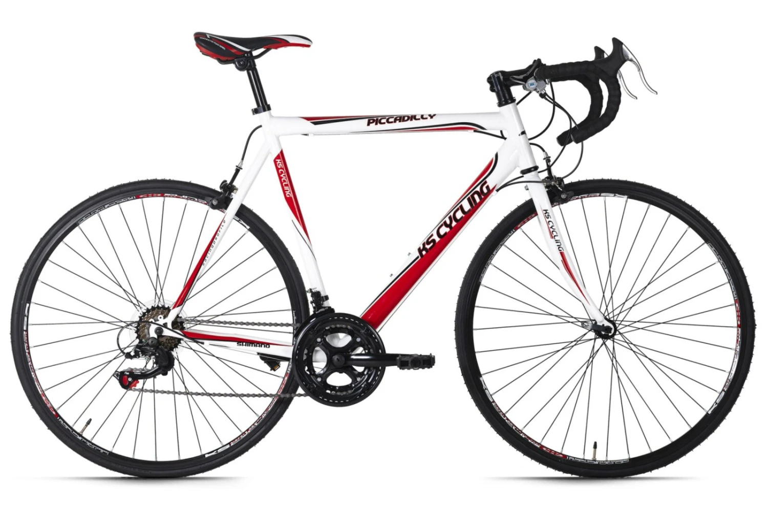 Das KS Cycling Rennrad Piccadilly in Weiß ist mit insgesamt 14 Gängen ausgestattet und überzeugt mit einem stabilen Stahl-Rahmen, sowie Aero-Aluminiumfelgen mit Verschleißindikator. Das Fahrrad ist ein absolutes Must-Have für alle, die gerne mit dem Zweirad Rennen fahren und schnell ans Ziel kommen wollen. Dabei unterstützt dich ein bequemer Rennsattel und auch die Dual-Pivot-Rennbremsen.