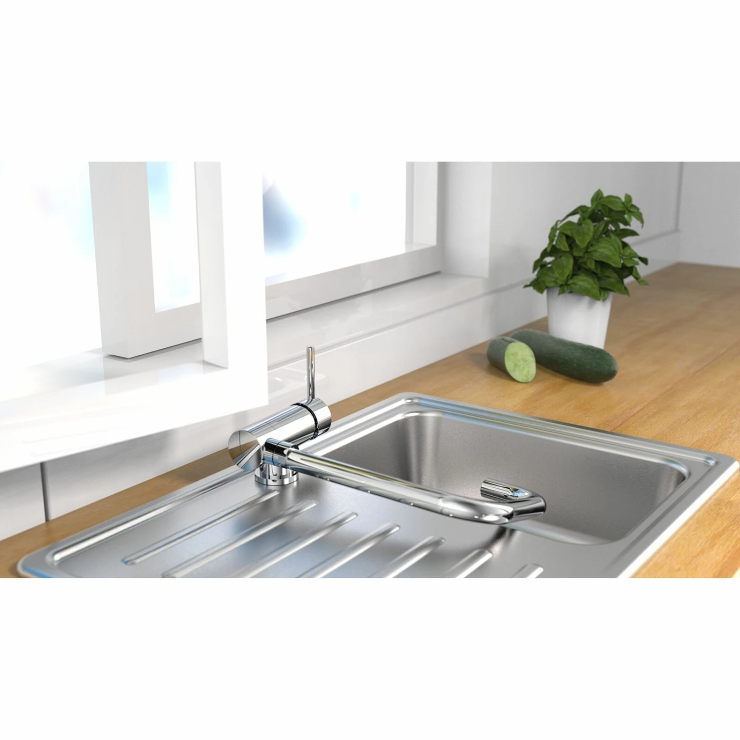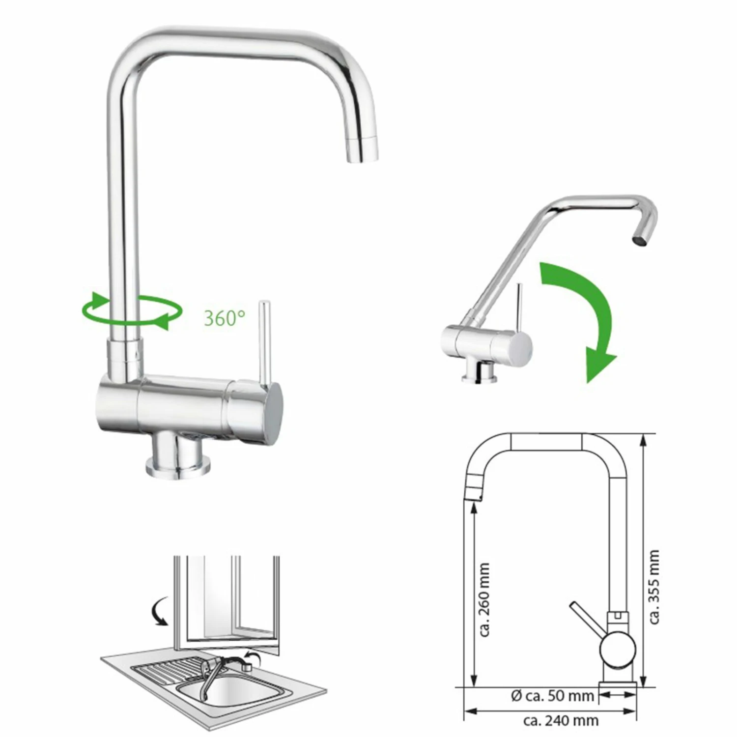 Die um 360° drehbare Küchenarmatur fügt sich nahtlos durch das edle Chrom-Design in Ihre Küche ein. Durch die Möglichkeit diese Armatur umzuklappen, lässt diese sich auch beispielsweise problemlos unter einem Fenster montieren. Dank Kaltwasserstart ist diese Küchenarmatur besonders wasser- und energiesparend.