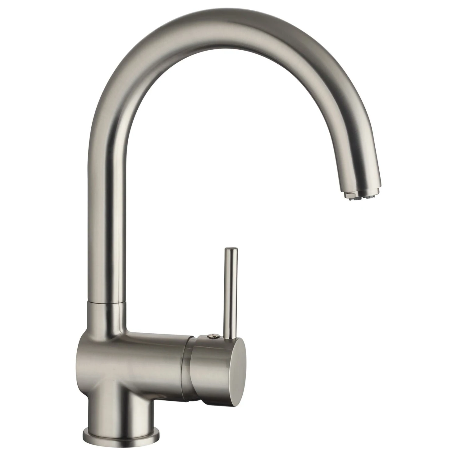 Diese schicke Küchenarmatur in Edelstahloptik peppt jede Küchenspüle auf. Der hohe formschöne Bogen macht diese Armatur zu einem echten Hingucker. Die Armatur ist ausschließlich für Niederdruck und Kleinspeicher geeignet. Leichtes Anschließen wird durch die im Lieferumfang enthaltenen flexiblen Edelstahl-Anschlussschläuche gewährleistet. Bei Griff-Mittelstellung verfügt die Armatur über einen Kaltwasser-Start, der energiesparend wirkt.
