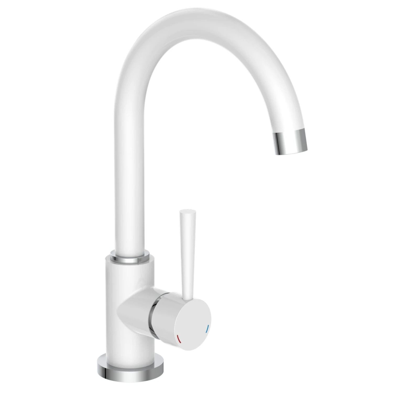 Die weiße Hochdruck-Küchenarmatur lässt sich dank ihres Designs und der Farbgebung mit sämtlichen Einrichtungsstilen kombinieren und ist mit einem schwenkbaren Auslauf ausgestattet. Der seitliche Metallgriff verfügt über eine Cool-Start-Funktion, die für eine effiziente Nutzung von Wasser und Energie sorgt.