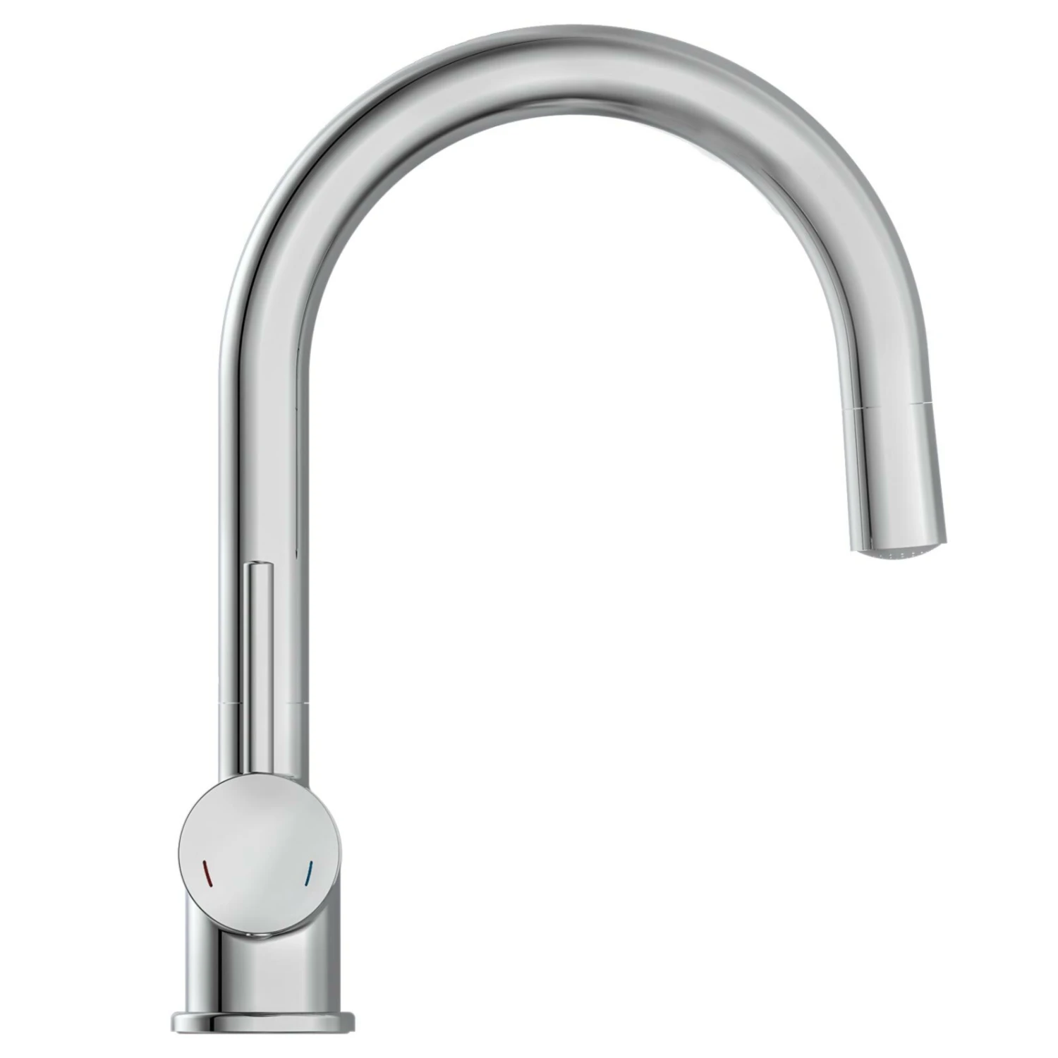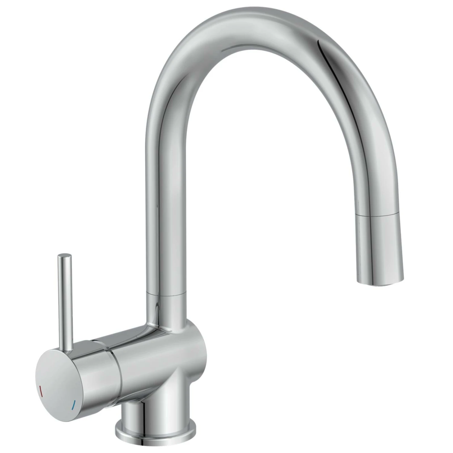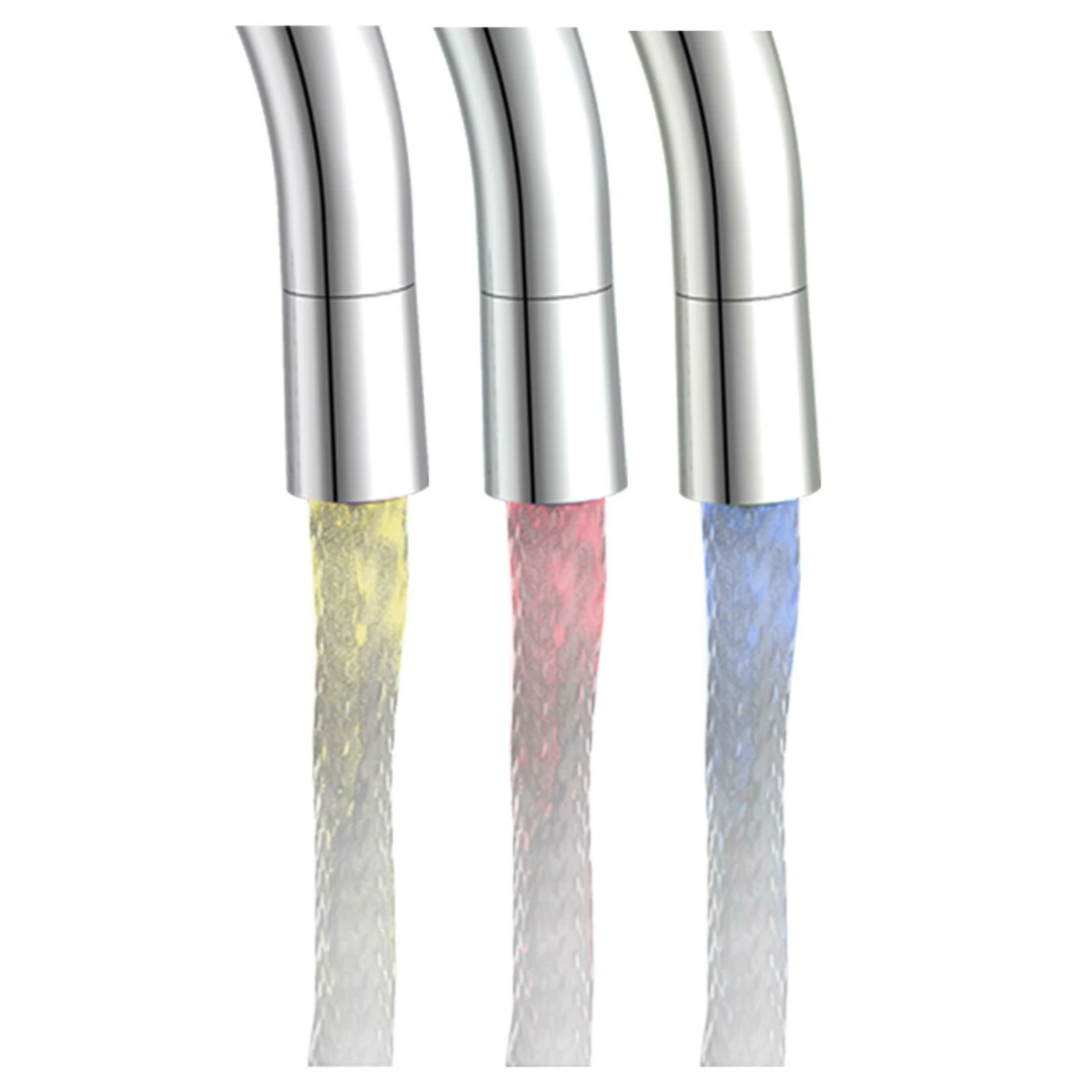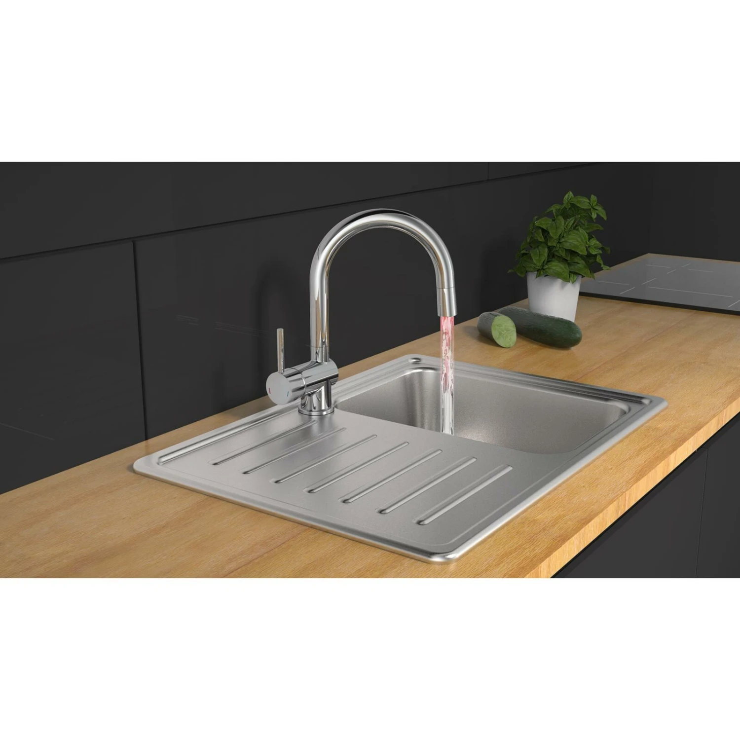 Bogenförmige Küchenarmatur mit LED-Beleuchtung, die je nach Temperatur ihre Farbe wechselt. Je nach Temperatur leuchtet es Blau, Grün oder Rot. Der Aufsatz ist austauschbar, so dass Sie die moderne und formschöne Armatur auch mit einem handelsüblichen Aufsatz benutzen können. Durch einen Kaltwasser-Start bei Griff-Mittelstellung ist die Armatur sehr energiesparend. Mithilfe einer Eco-Kartusche ist sie zudem sehr wassersparend. Bringen Sie jetzt Farbe in Ihre Küche!
