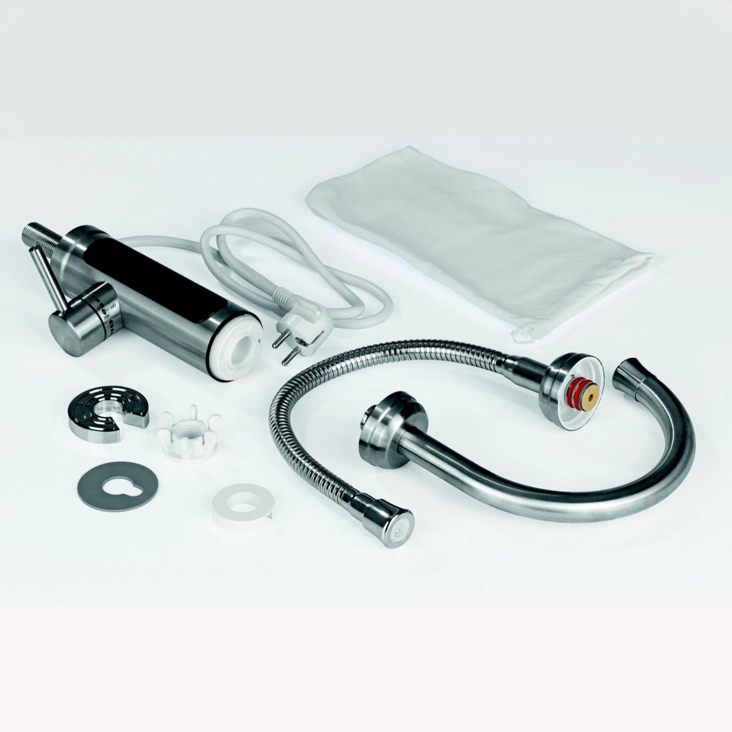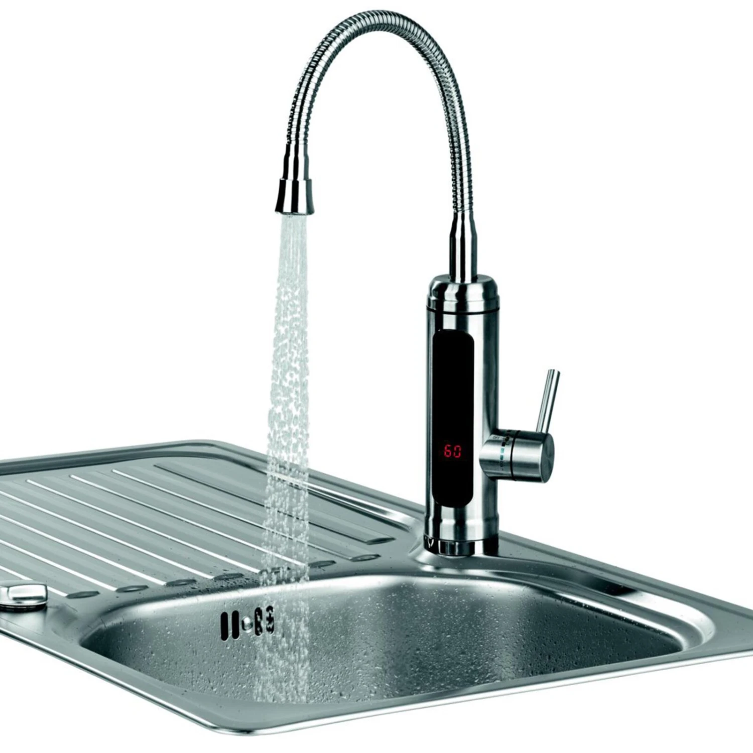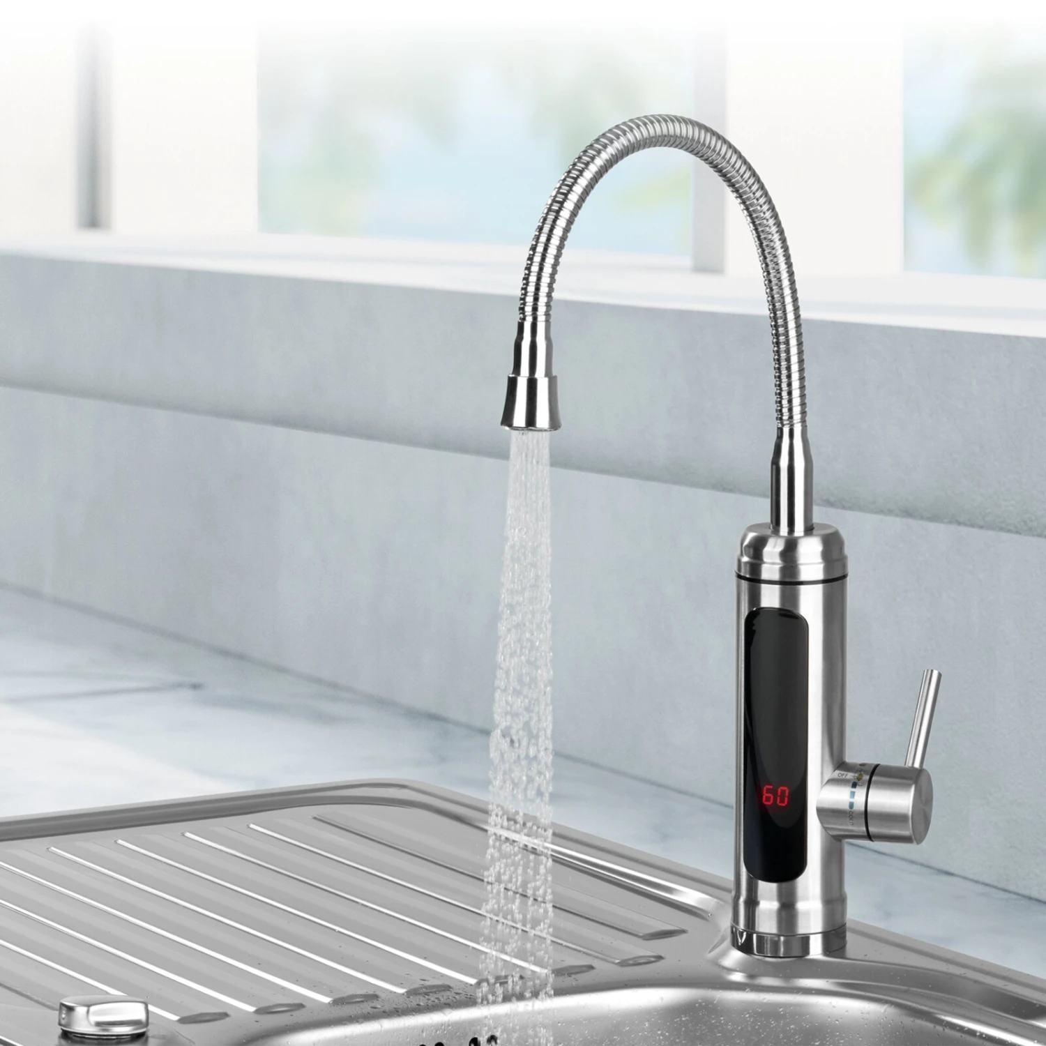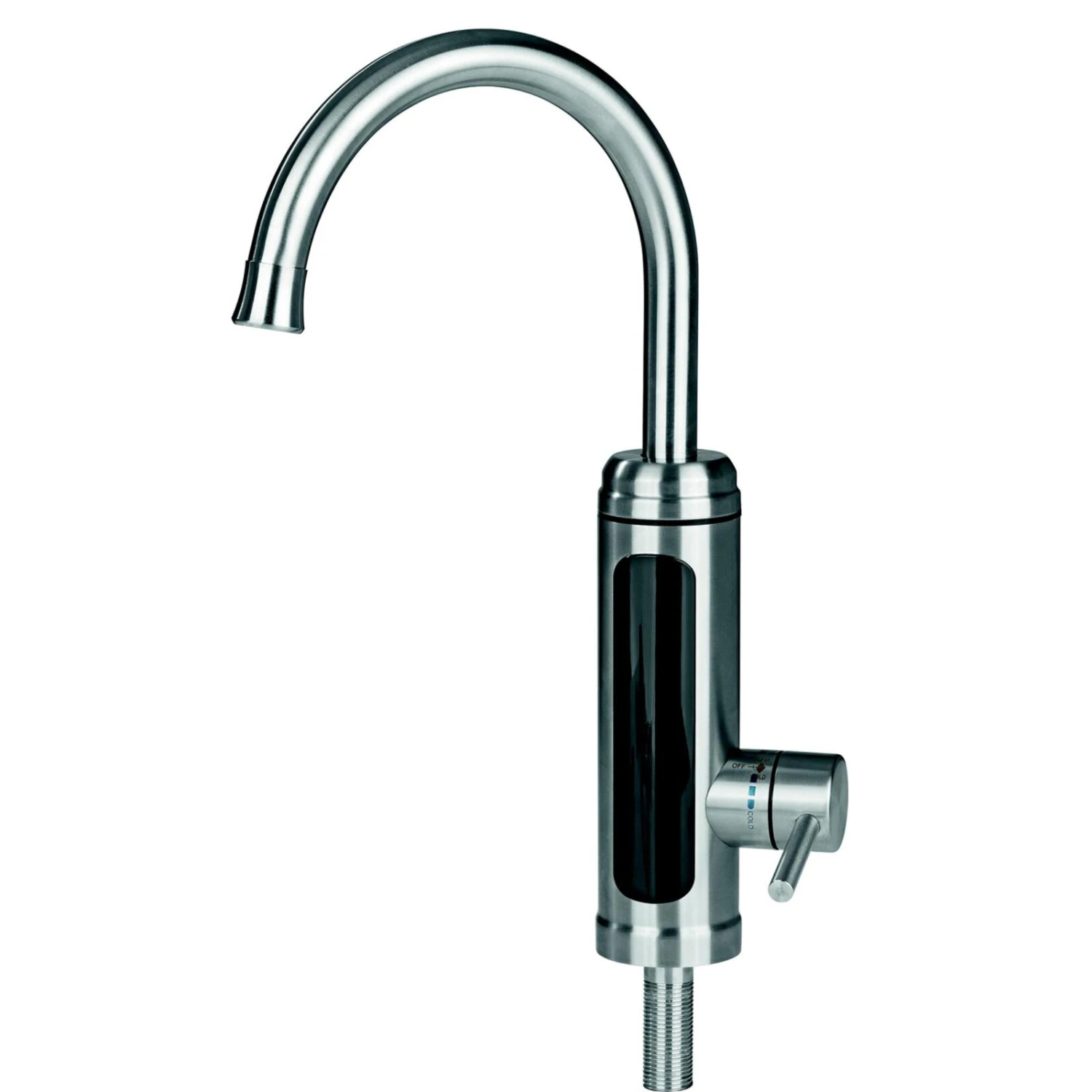 Kompakt und praktisch – die Waschtischarmatur mit integrierter, leistungsstarker Heizspirale bringt Ihnen warmes Wasser auch auf die Terrasse, den Wohnwagen, den Garten oder die Werkstatt. In Sekundenschnelle ganz ohne Vorheizen und Speicher erhalten Sie Wasser je nach Wasserdruck von etwa 60 °C. Wählen Sie dazu einen der um 360° schwenkbaren Wasserhahn-Aufsätze aus. Sie können je nach Bedarf das Standardmodell verwenden oder den flexiblen Wasserhahn. Die Armatur können Sie nahezu überall verwenden, wo es einen Wasser- und Stromanschluss gibt. Mit der LED-Anzeige haben Sie die aktuelle Temperatur immer im Blick. Die Armatur ist aus rostfreiem Edelstahl gefertigt und somit auch langlebig.