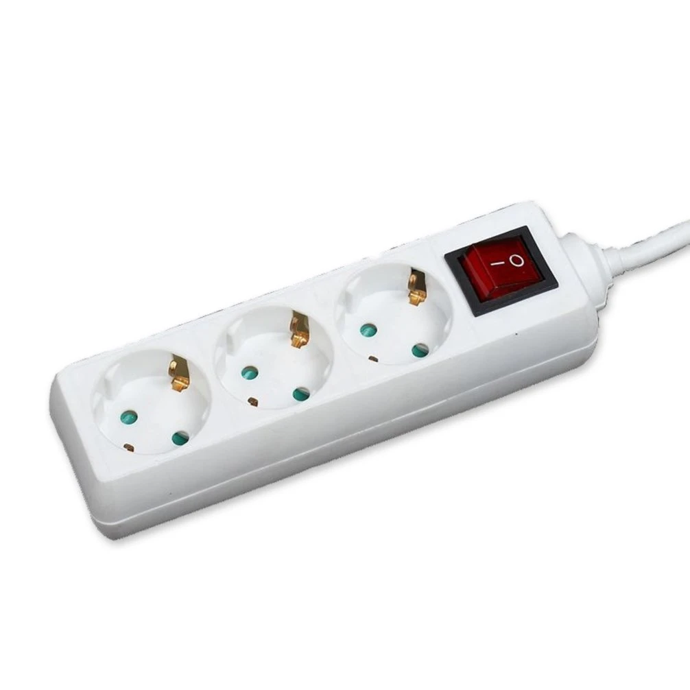 Weiße Mehrfachsteckdose mit 3 Schutzkontakt-Steckplätzen und zentralem Kontrollschalter. Durch eine Kabellänge von ca. 1,4 m haben Sie viel Spielraum bei der Platzierung und Nutzung elektronischer Geräte.