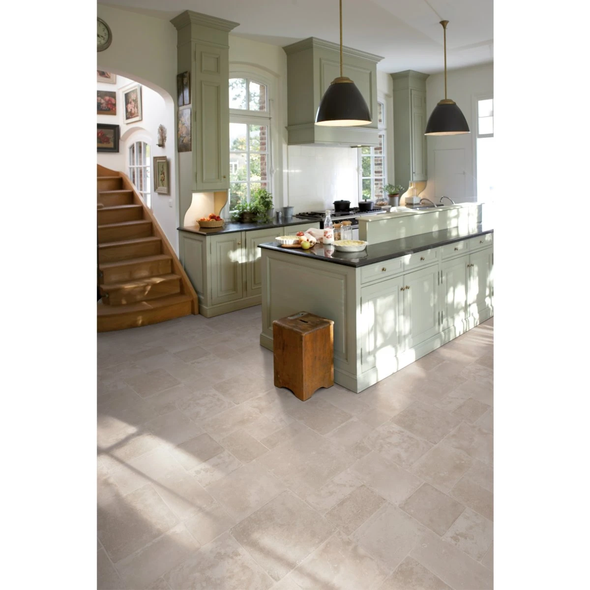 Der PVC-Bodenbelag in beigefarbener Fliesentoptik sorgt nicht nur für ein mediterranes Flair, sondern ist auch bestens für die Verlegung auf Böden mit Fußbodenheizung geeignet. Das Material besteht zu 100% aus Polyvinylchlorid und ist daher sehr pflegeleicht