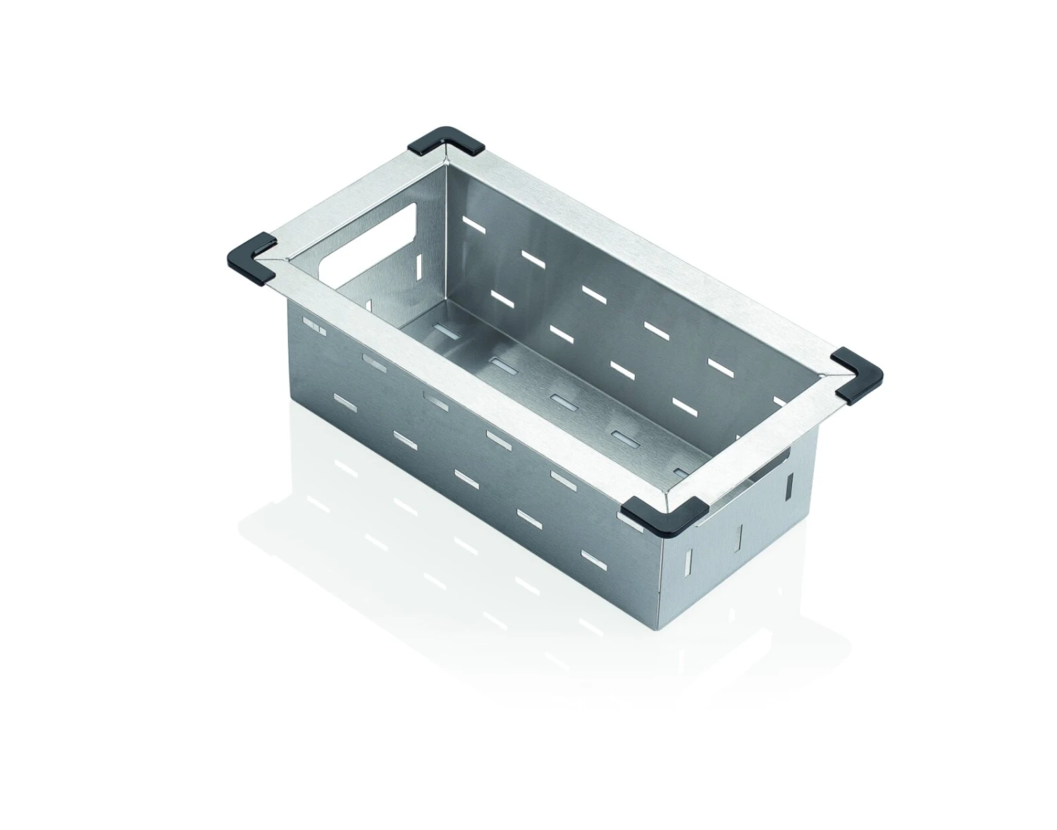 Restebeckeneinsatz aus Edelstahl mit schwarzen Kunststoffecken, geeignet für Spülen mit einer Bautiefe von 40 cm. Ein praktisches Zubehör und auch optisch eine schöne Erweiterung für Ihre Spüle.