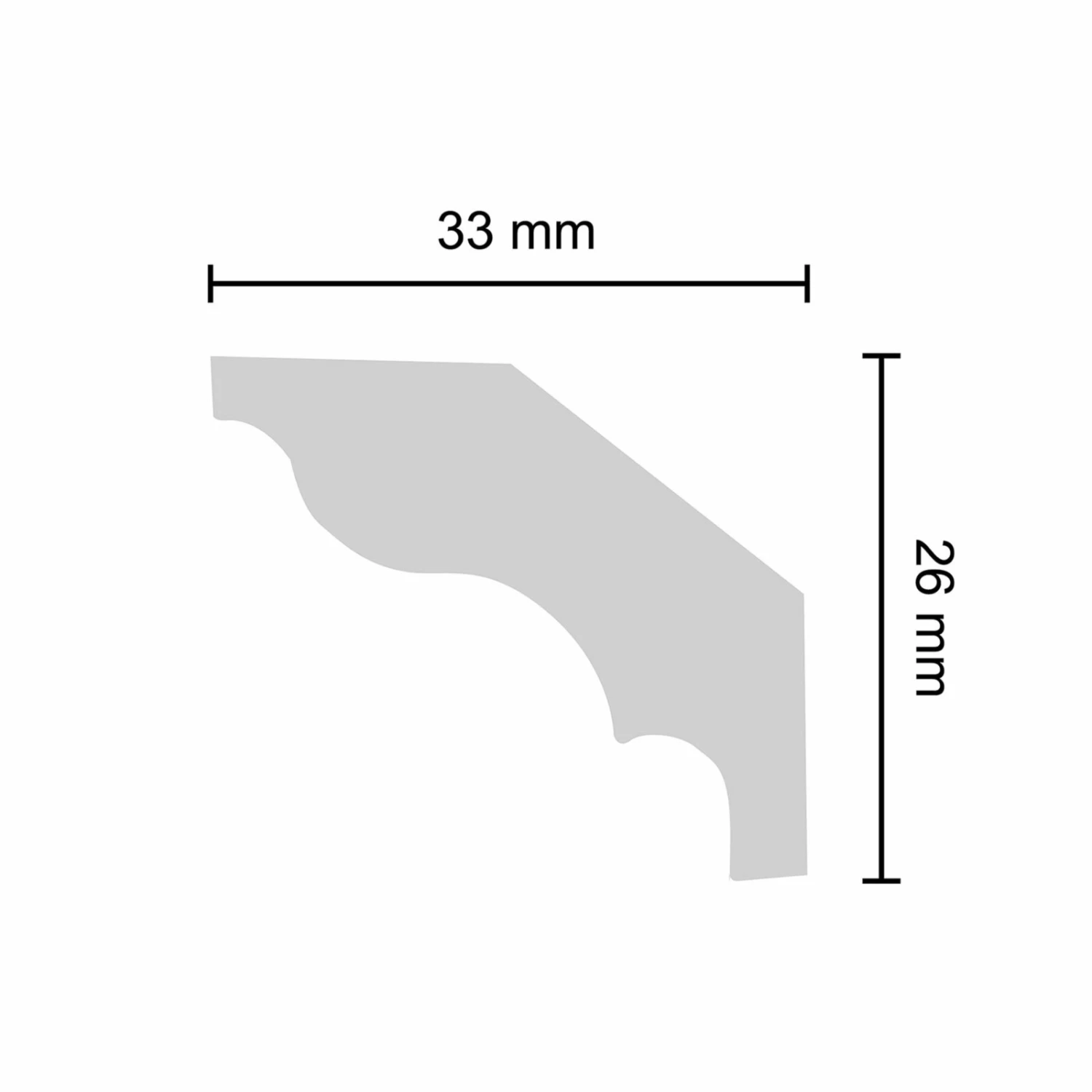Das Stuckprofil schafft mit seinen Maßen von etwa 33 x 26 mm einen schönen Übergang zwischen Decke und Wand. Dank des leichten Materials ist eine einfache und schnelle Montage garantiert.