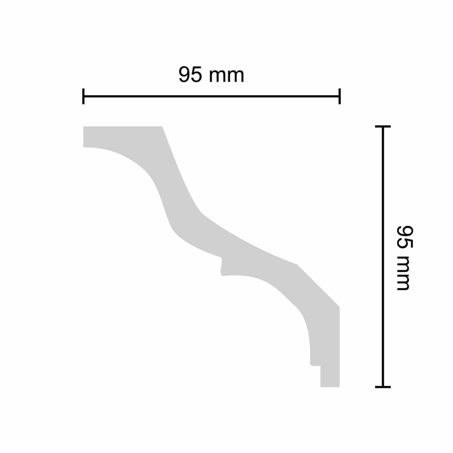 Die Styropor-Zierleiste gehört mit seinen Maßen von etwa 95 x 95 mm zu den eleganten Dekoren. Dank des leichten Materials ist eine einfache und schnelle Montage garantiert.