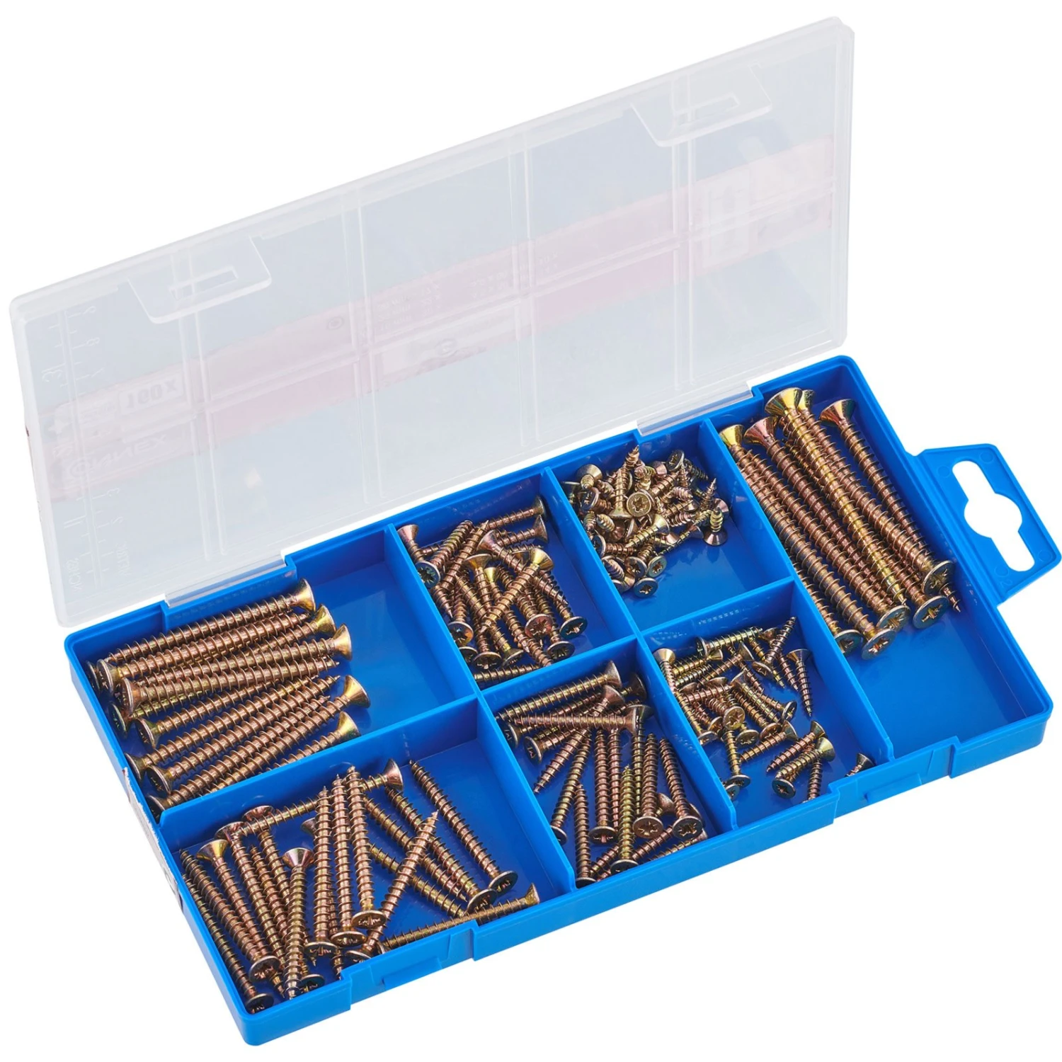 In diesem Schraubenkasten- Set erhalten Sie sieben verschiedenen Größen und 160 Schrauben in ein Sortimentskasten.