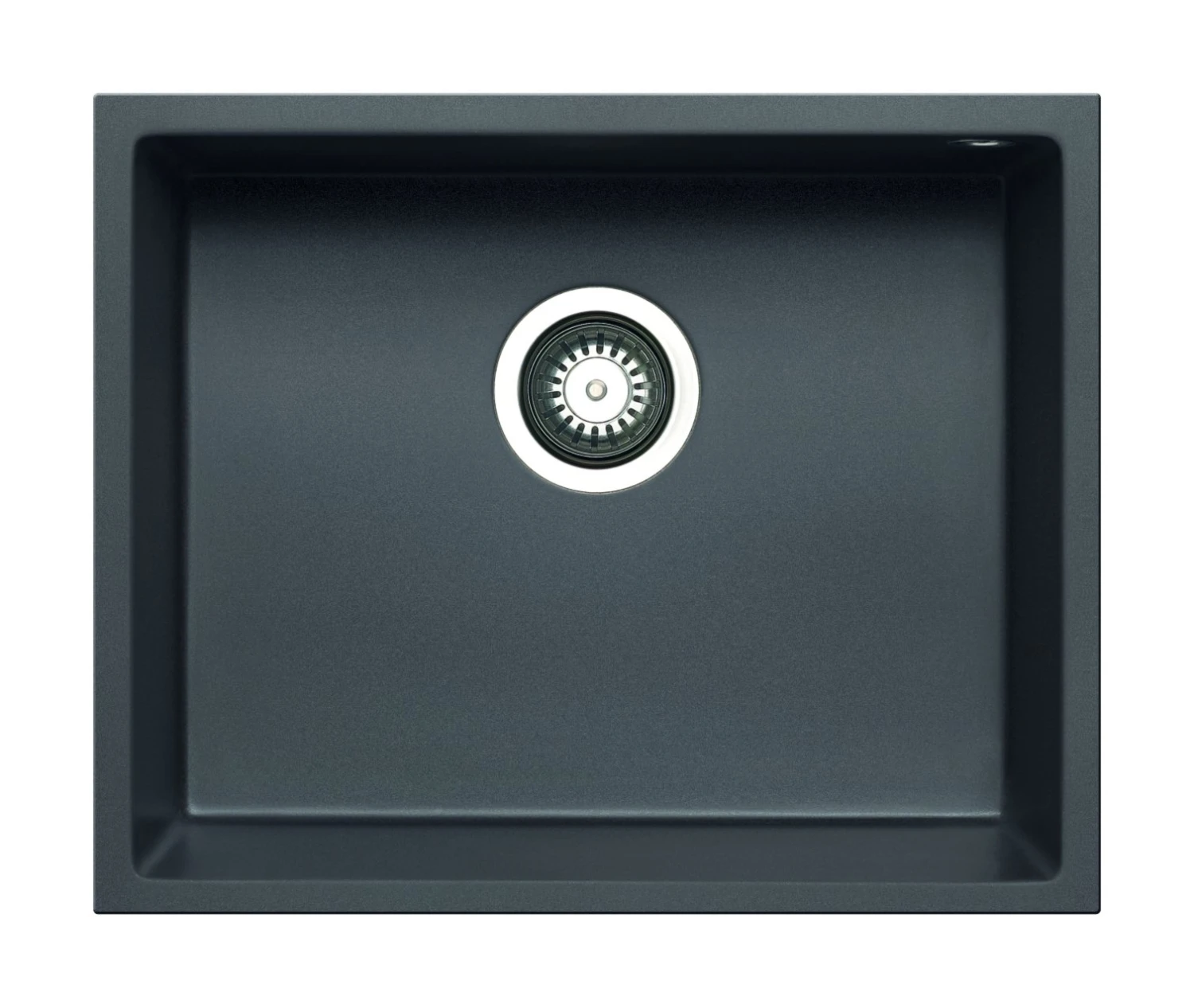 Graues Unterbaubecken TETRAGON aus Pyragranite in rechteckiger Form. Diese moderne Spüle wird in die Arbeitsplatte „eingelassen“ und ist mit Ab- und Überlaufgarnitur ausgestattet, sowie einem Siebkorb-Ventil.