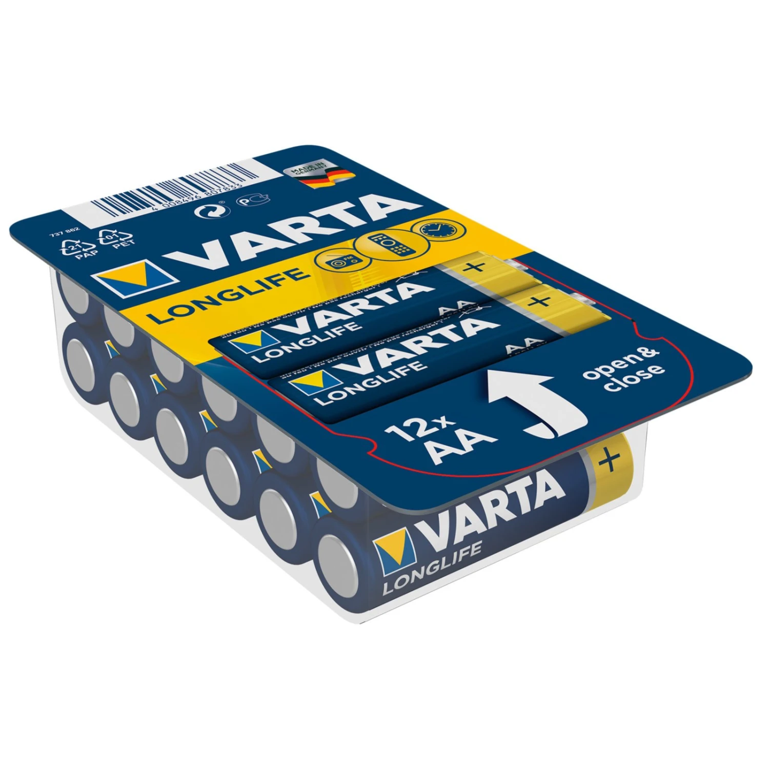 Praktisches 12er-Set LONG LIFE AA VARTA Batterien für Radios, Uhren, Fernbedienungen und viele weitere Elektrogegenstände.