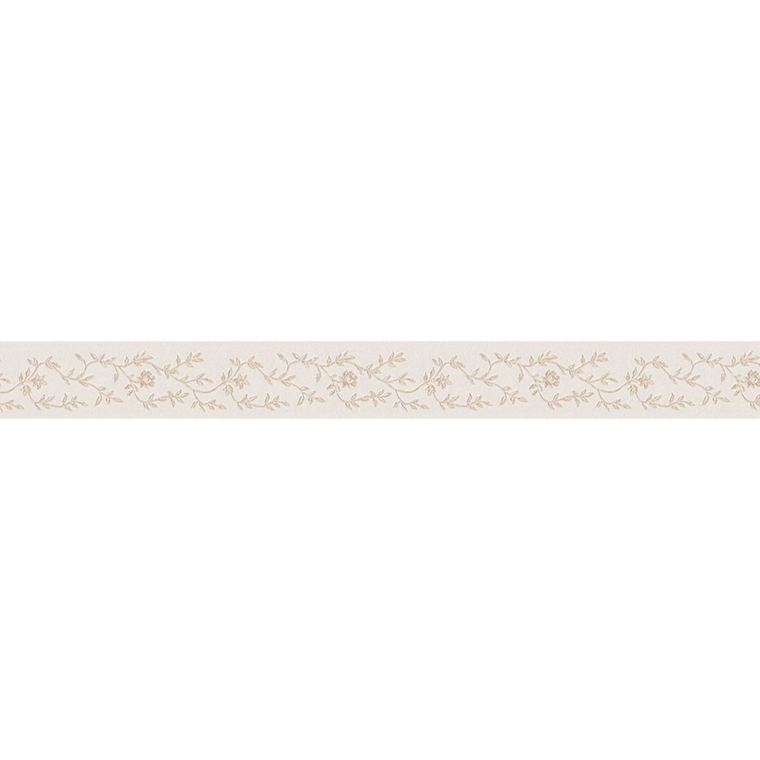 Ausgefallene beigefarbene Vinyl-Borte mit einer Blumenranke. Diese Borte ist selbstklebend, benötigt somit kein Zubehör und ist besonders einfach anzubringen. Sie setzt einen besonders schönen Akzent zum Beispiel auf einer hellen Tapete.