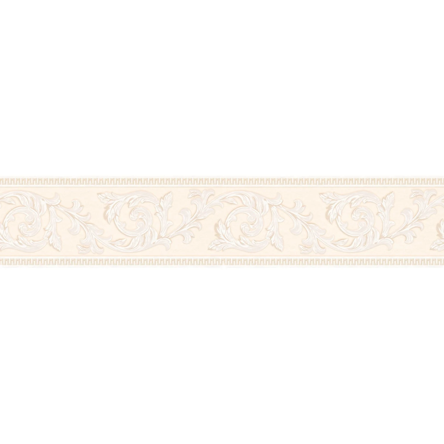 Barocke Vinyl-Borte ONLY BORDERS 7 mit Ornamenten in Beige. Diese Borte ist selbstklebend, benötigt somit kein Zubehör und ist besonders einfach anzubringen. Sie setzt einen besonders schönen Akzent zum Beispiel auf einer dunklen Tapete.