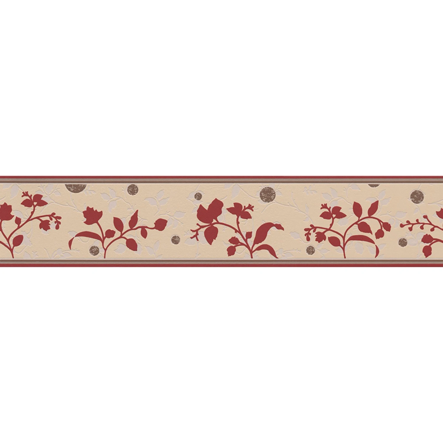 Creme- und bordeauxfarbene Vinyl-Borte ONLY BORDERS 8 mit Blumenmuster. Diese Borte ist selbstklebend, benötigt somit kein Zubehör und ist besonders einfach anzubringen. Sie setzt einen besonders schönen Akzent zum Beispiel auf einer hellen Tapete.