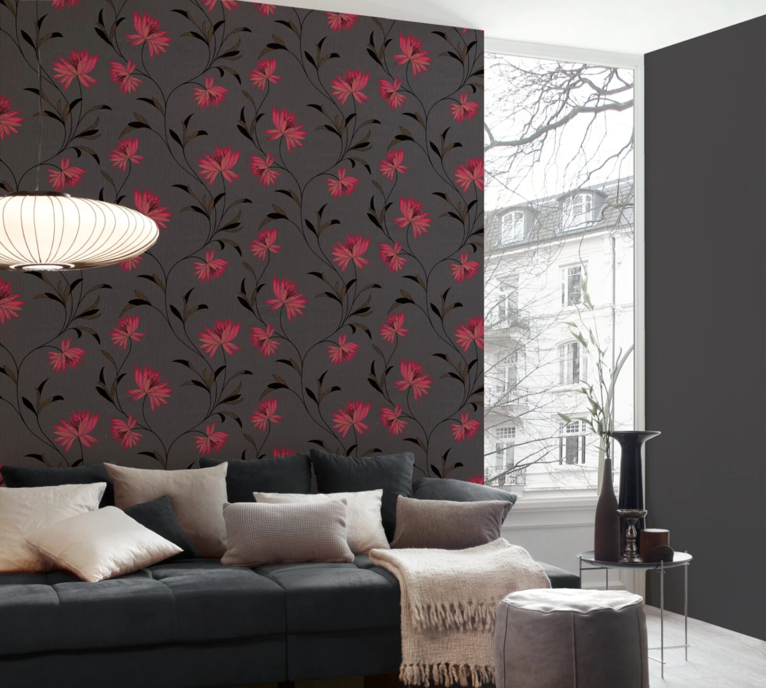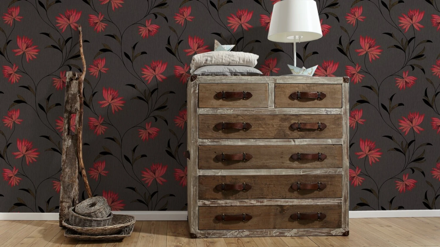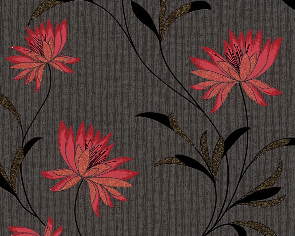 Vinyltapete ATLANTA – rot-schwarz – Blumen – 10 Meter