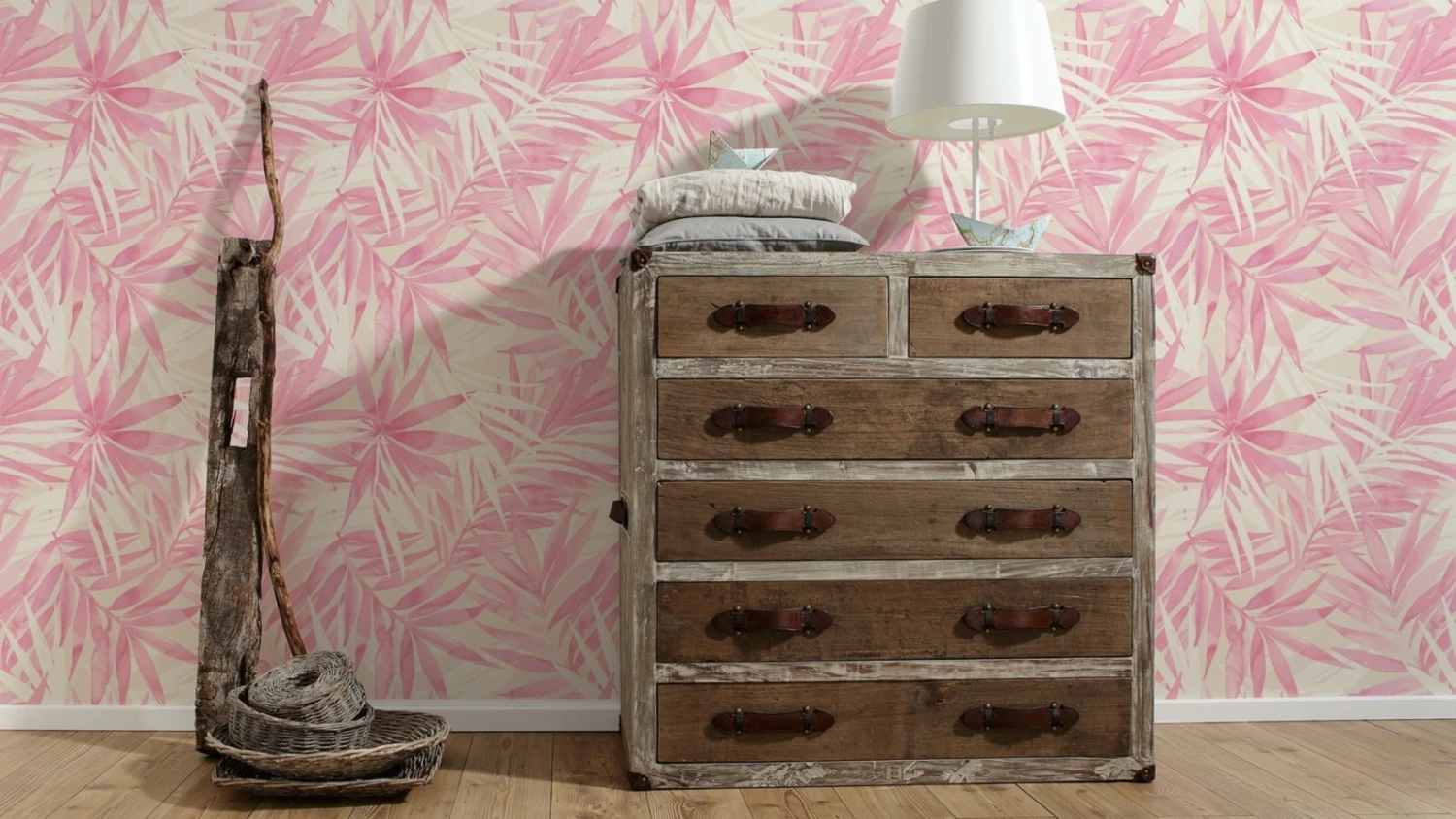 Designdschungel 2, das Programm für Lauras Lifestyle-Blog und ihre Tapetendesigns: Feine Palmen-Prints bringen tropisches Feeling in die Räume und verwandeln Wände in die perfekte Bühne für Möbel und Wohn-Accessoires.