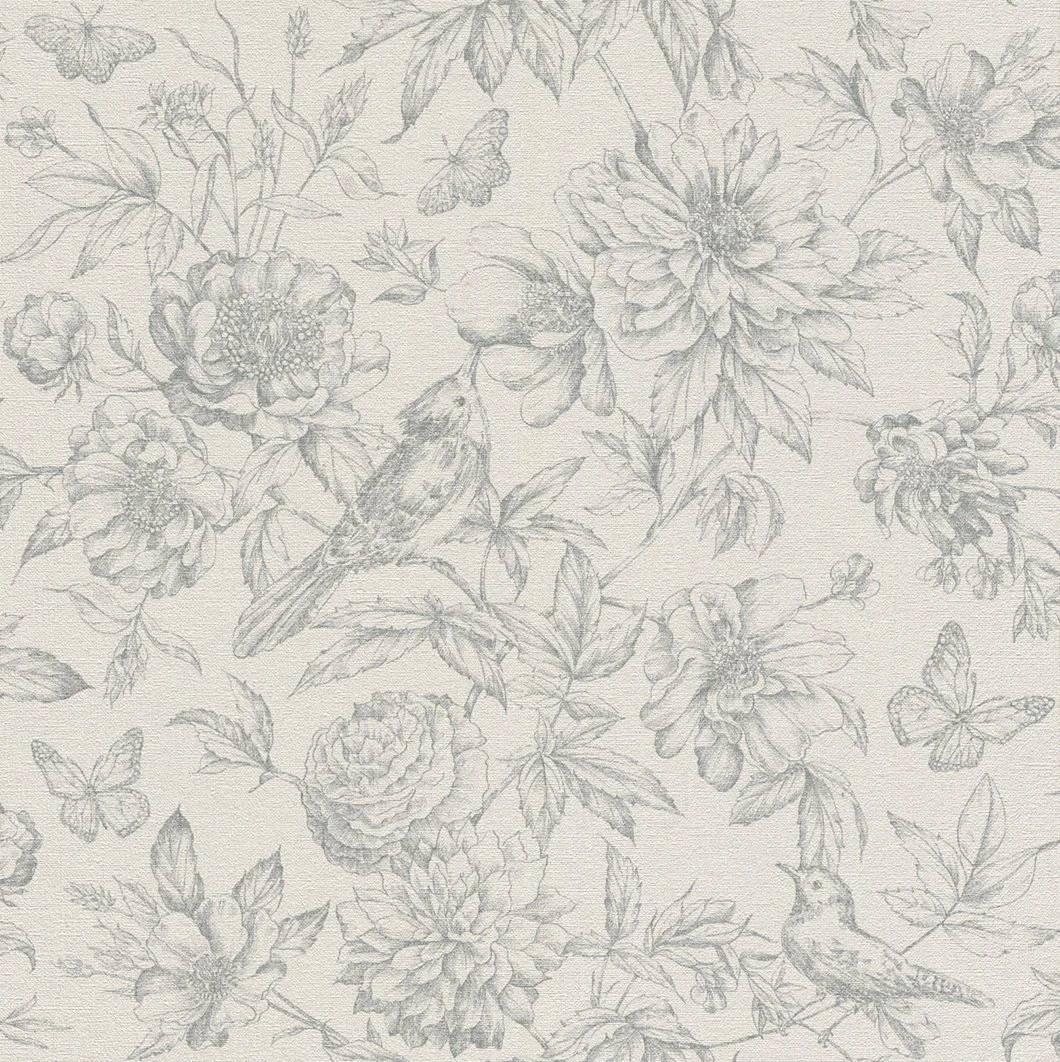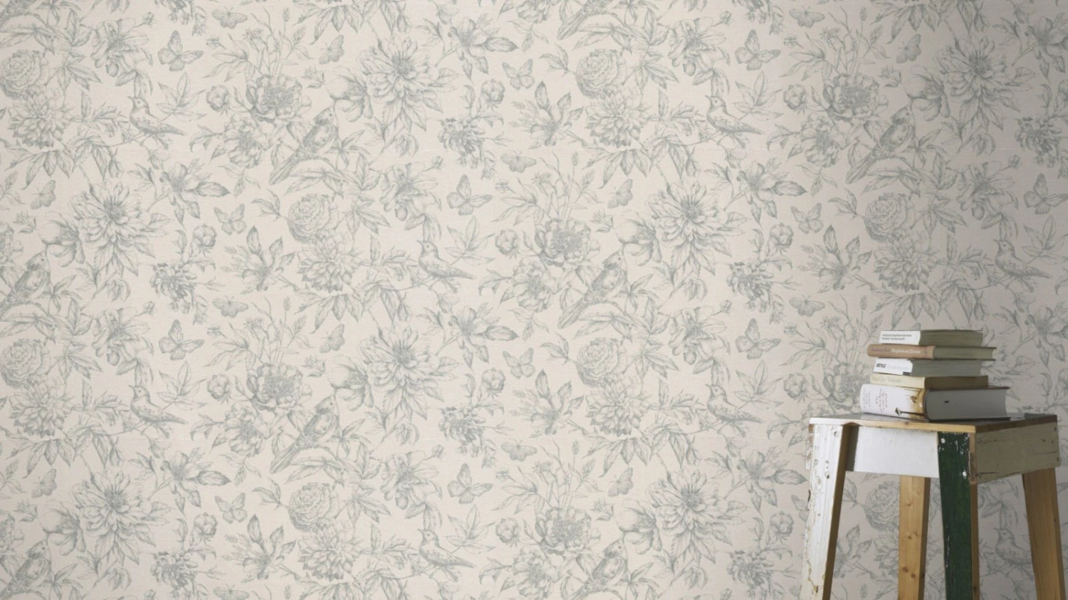 Wie mit einem feinen Bleistift gezeichnet, ranken auf dem textilwirkenden Untergrund heimische Vogelarten, die es sich zwischen satten Blüten und zarten Blättern bequem machen. Ein Motiv, das einem auf Anhieb den Frühling ins Haus holt, auch wenn es von klassisch-gedeckten Farben dominiert wird.