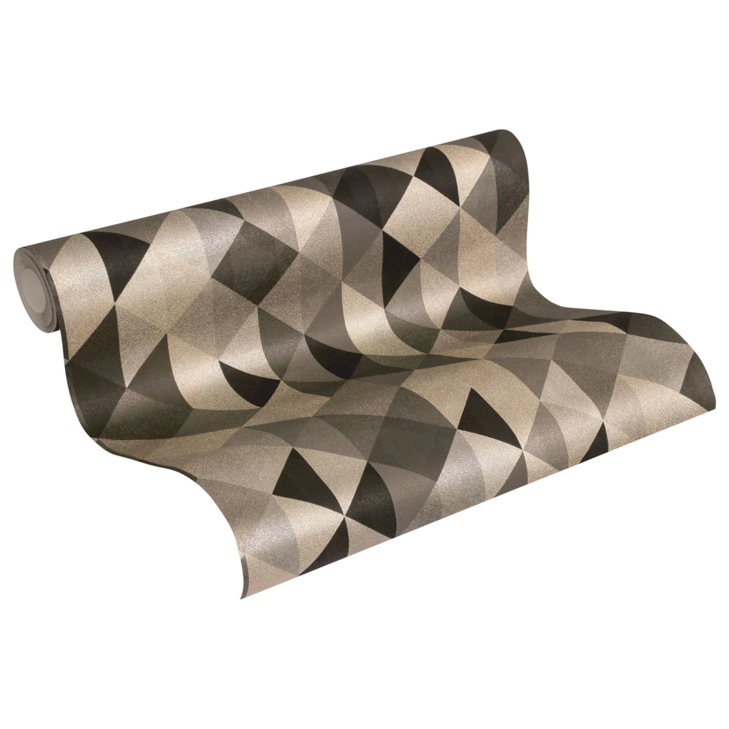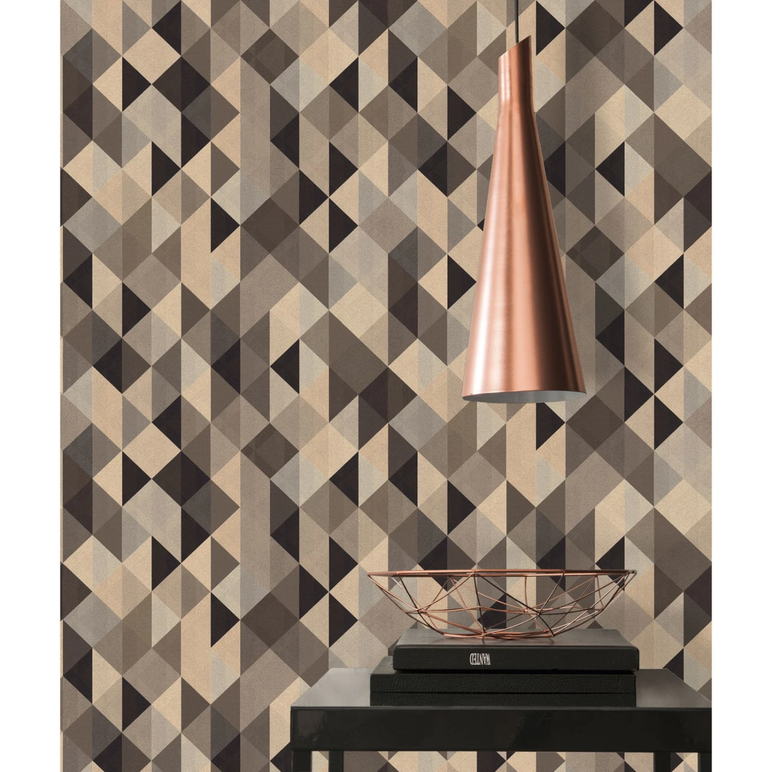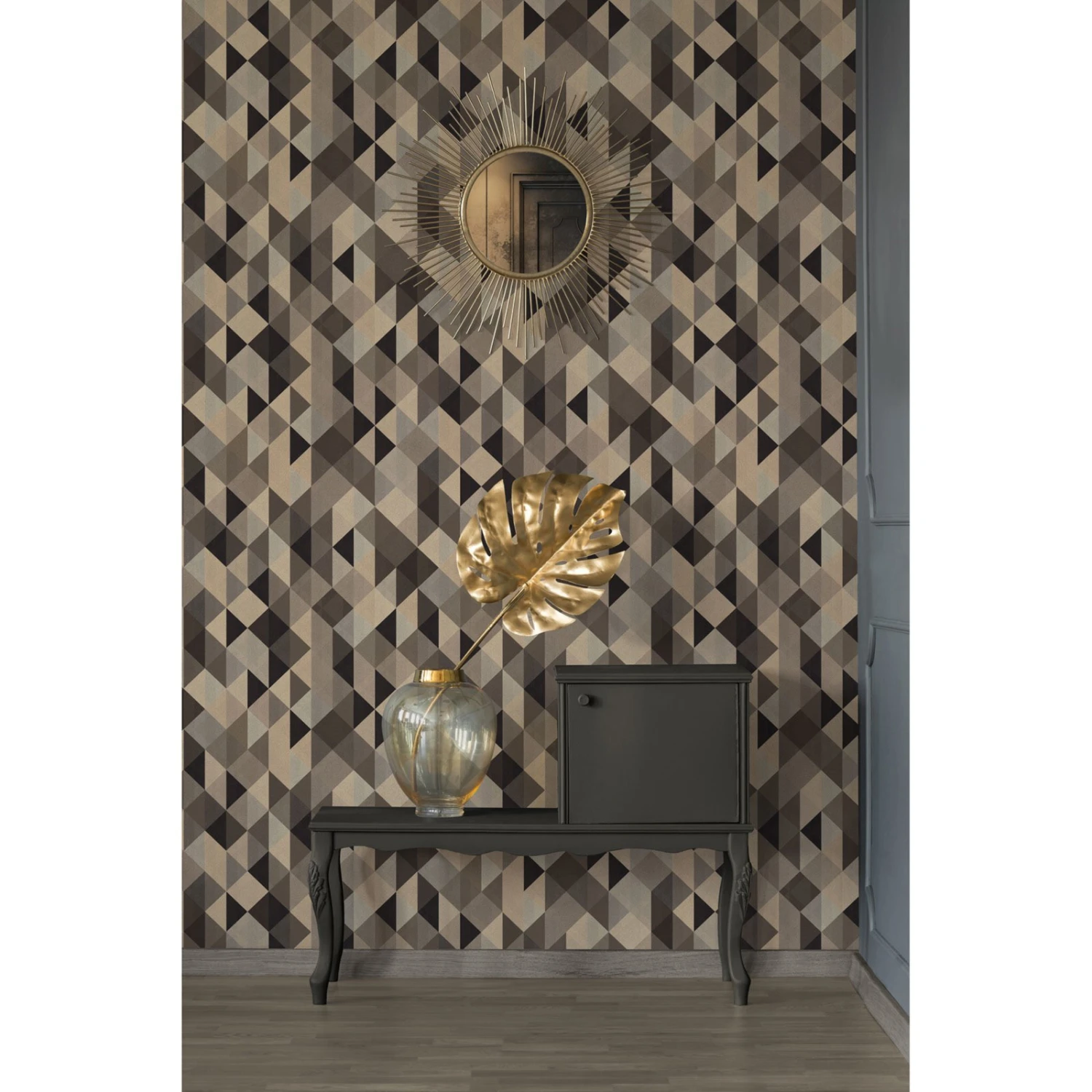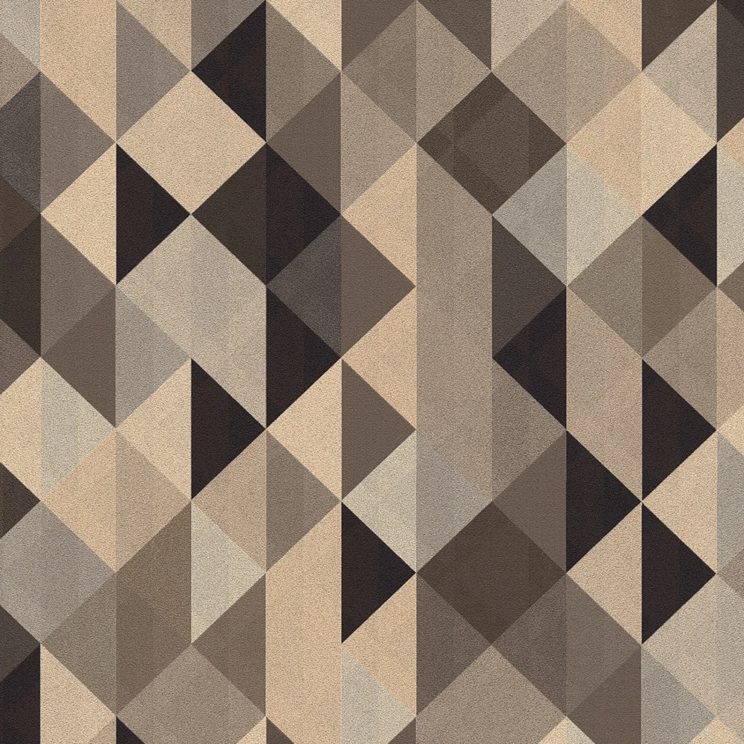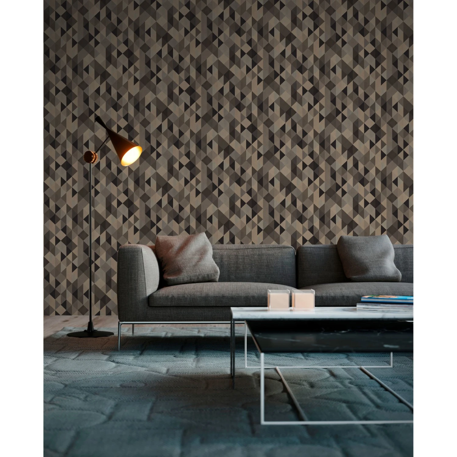 Eine besondere Vliestapete in Schwarz-Braun mit geometrischen Dreiecken wird zum echten Hingucker in Ihrem Zuhause.