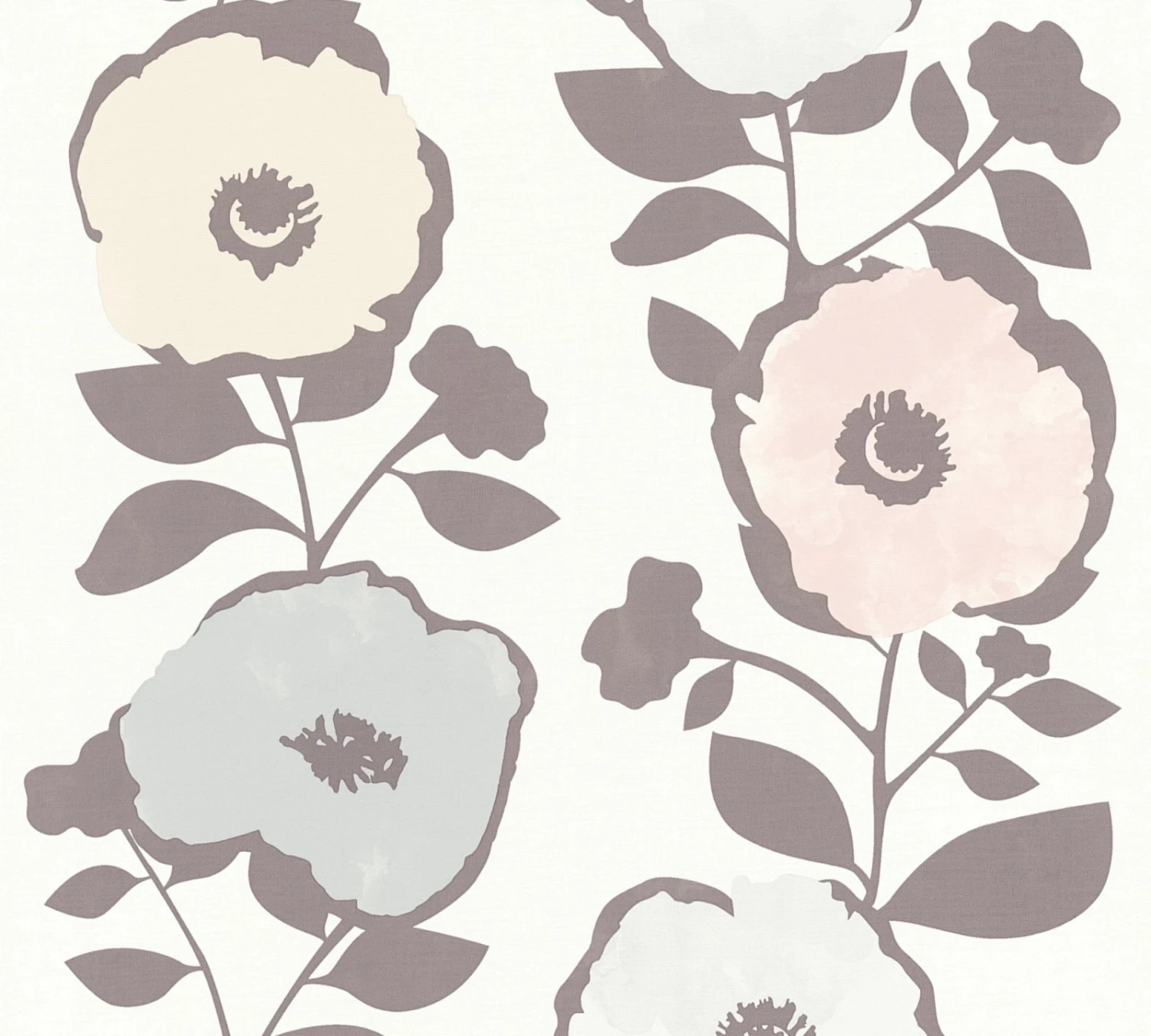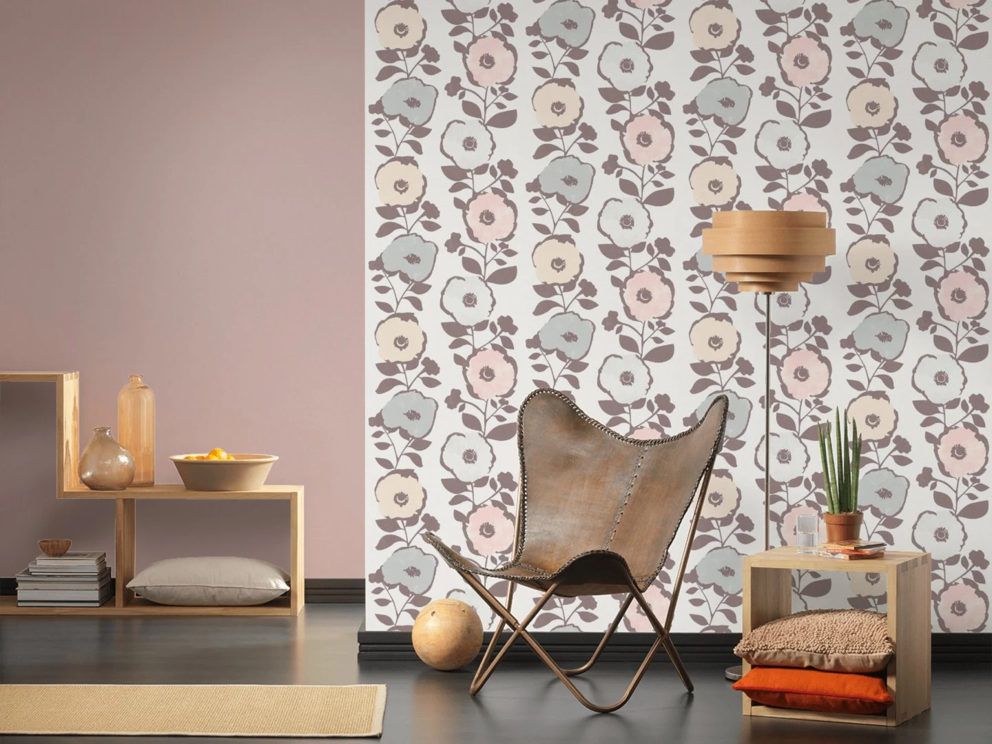 Blumen in Weiß, Grau und Rosa zieren diese Tapete der Kollektion SCANDINAVIAN 2. Eine fröhliche Atmosphäre durchquert Ihren Raum und verteilt Frühlingsgefühle. Der Rapport ist gerade, die Tapete ist gut lichtbeständig und außerdem scheuerbeständig.