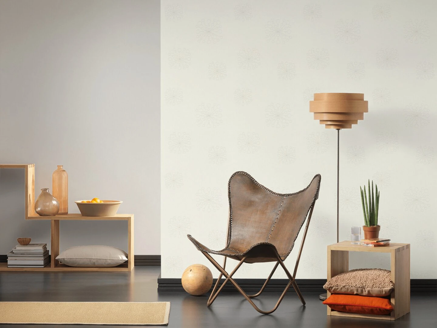 Eine unifarbene Tapete, passend zu einer tollen Tapete mit Muster ist immer eine gute Idee. Diese weiße Vliestapete fügt sich harmonisch in das Gesamtbild des Raumes ein.