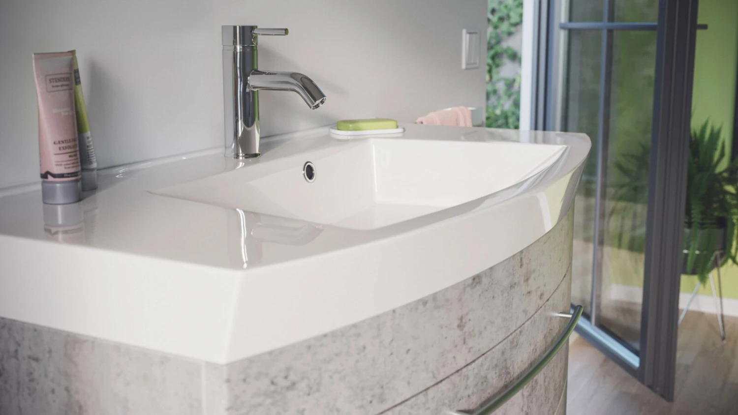 Dieser Waschtisch in Betonoptik ist durch seine abgerundeten Fronten ein echter Hingucker und kann in jedem Badezimmer eingesetzt werden. Die zwei Schubladen bieten eine Menge Platz für sämtliche Badutensilien und sind mit Softclose für ein leises Schließen ausgestattet. Im Lieferumfang ingebriffen ist bereits ein schönes Waschbecken aus Mineralguss.