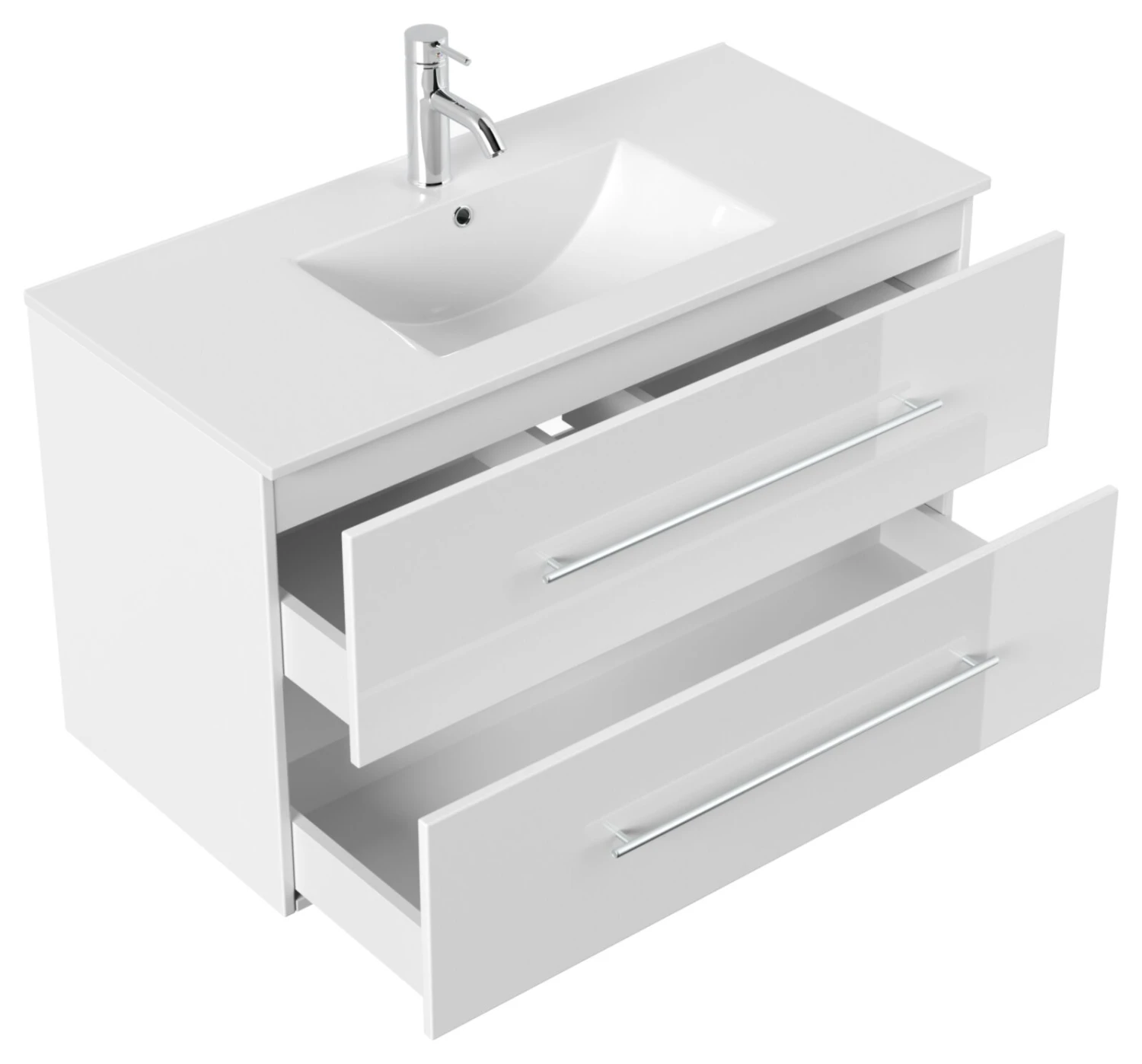 Mit diesem Waschtisch verschaffen Sie sich nicht nur genug Stauraum für Ihre Badutensilien, sondern beeindrucken auch Ihre Gäste. Der Waschtisch besizt zwei Schubkästen, die mit einem Soft-Close-System ausgestattet sind. Außerdem besitzt der Waschtisch Handgriffe aus Edelstahl, einen Waschbecken aus Keramik und eine glänzende Oberfläche. Innen besitzt der Waschtisch eine Melamin-Beschichtung, was die Reinigung sehr schnell und einfach macht.