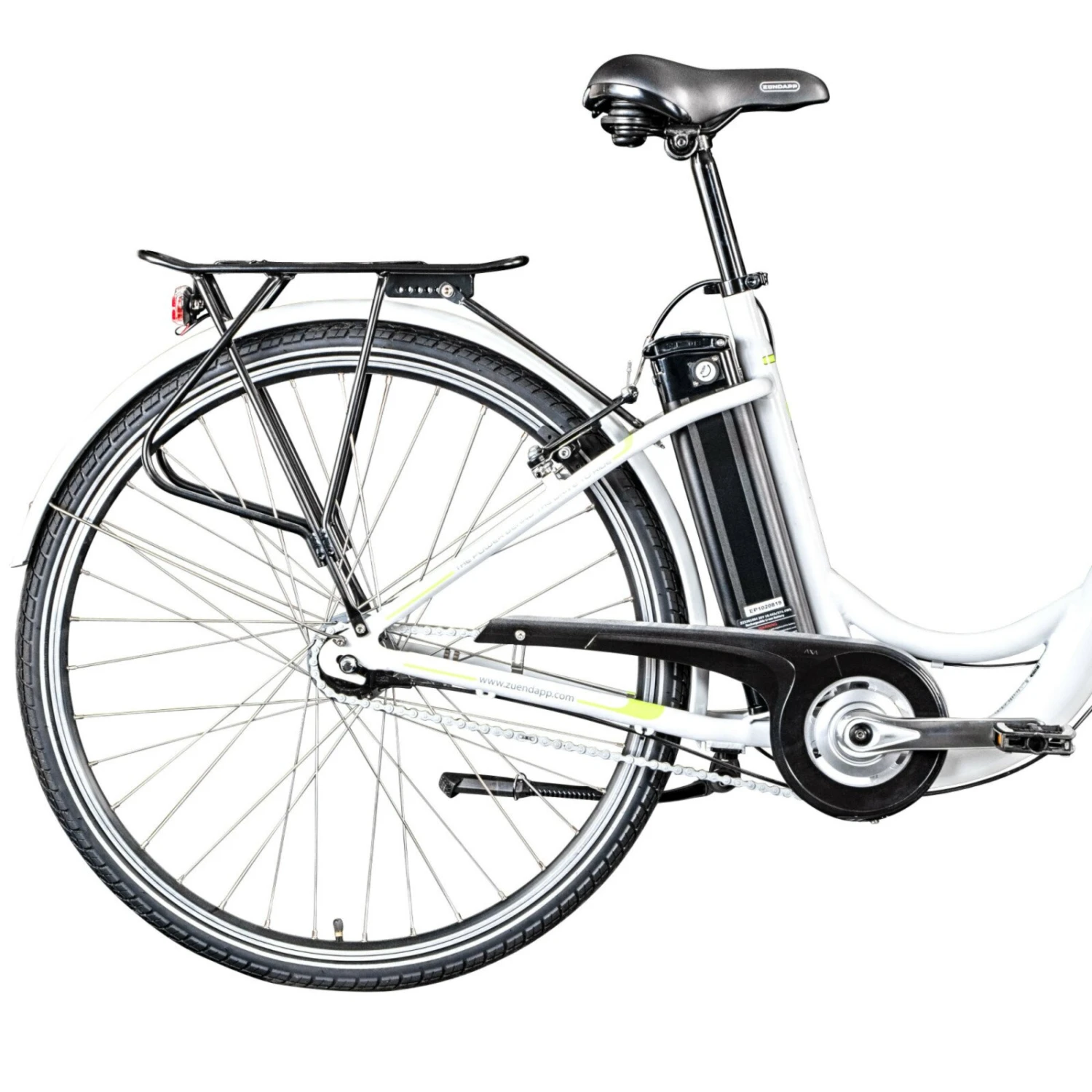 Schönes Zündapp Elektro Damenrad Z517 in Weiß und Gelb mit dem Sie alle Blicke auf sich ziehen! Auf dem bequemen Citysattel lassen sich auch längere Touren bewerkstelligen. Falls Sie einmal Unterstützung benötigen, können Sie über das Ananda LCD-Steuerdisplay ganz einfach den Elektromotor zuschalten.